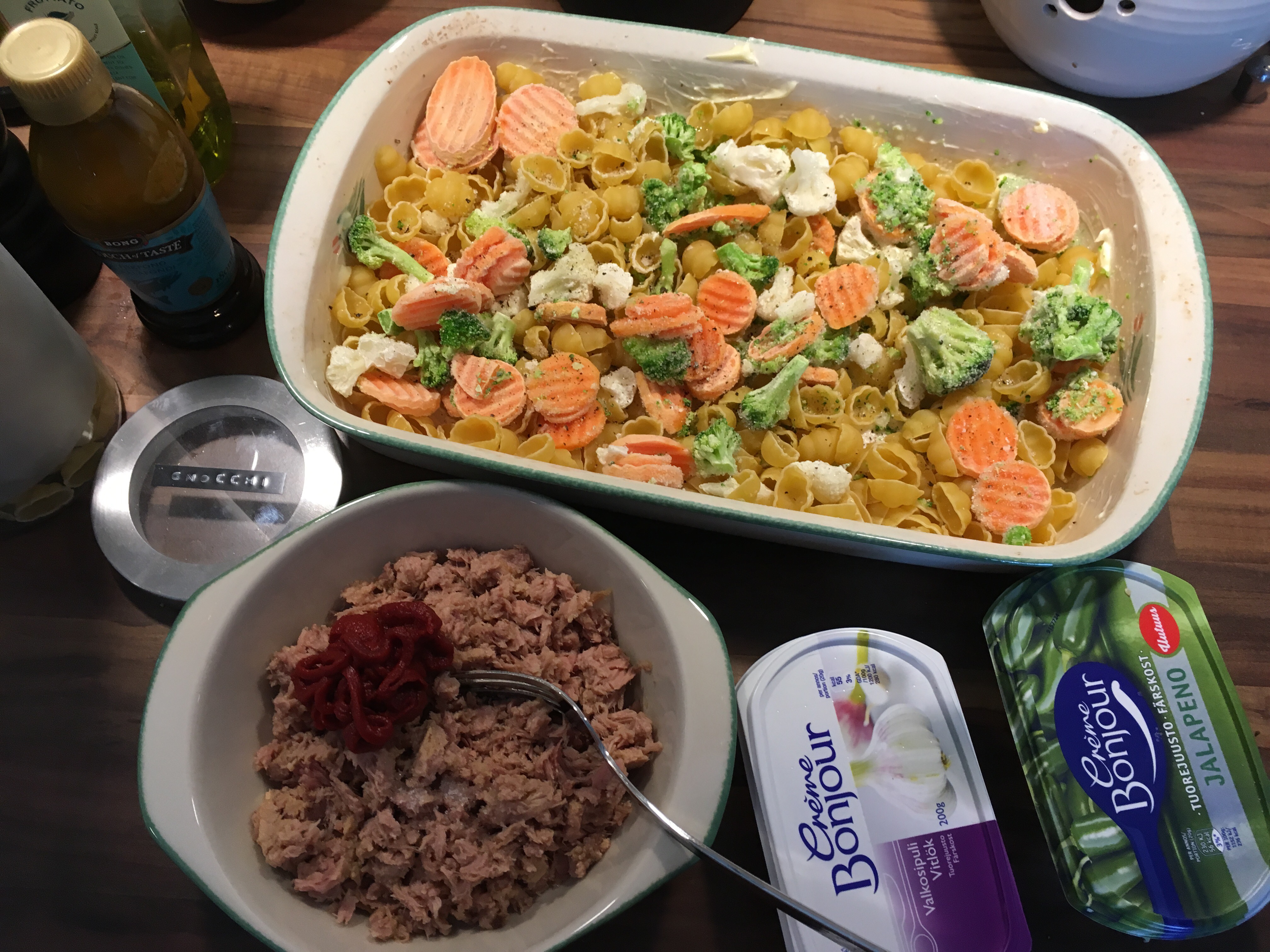 Kaada voideltuun uunivuokaan raaka pasta ja pakastevihannekset. Sekoita hieman valutettu tonnikala ja tomaattisose ja murustele pastan ja vihannesten joukkoon. Lisää tuorejuusto (köytin jalapeno- ja valkosipulipurkkien loput) nokareina joukkoon. Mausta suolalla ja pippurilla. Sekoita fondi veteen ja kaada vuokaan. Lisää kerma ja ripottele pinnalle tilliä. Paista 200 asteessa kunnes neste on imeytynyt pastaan eli noin tunnin ajan