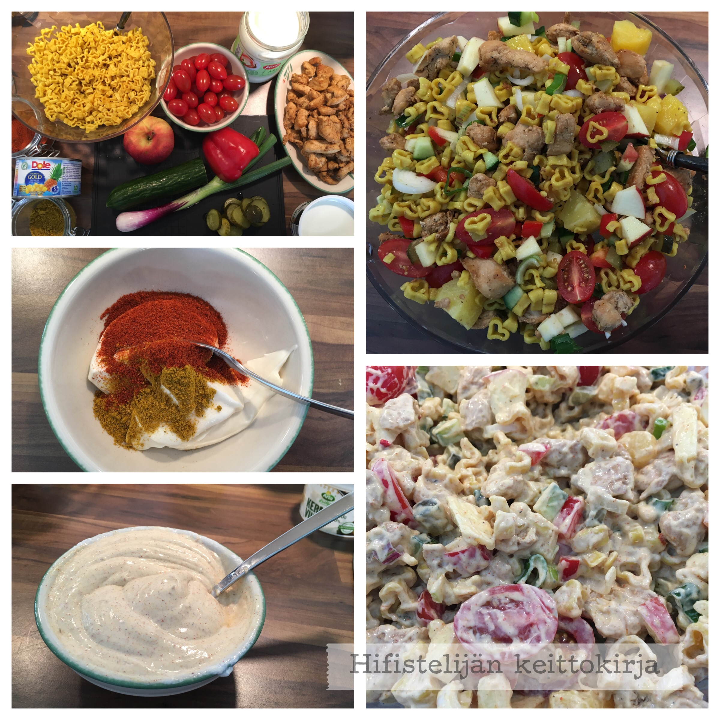 Keitä pasta suolalla maustetussa vedessä ja anna jäähtyä. Paista broilerisuikaleet ja mausta soijalla ja mustapippurilla. Pese ja pilko vihannekset. Sekoita vihannekset, pasta ja broilerisuikaleet suuressa kulhossa. Sekoita curry ja paprikajauhe majoneesiin. Jos käytät suolatonta currya niin lisää makusi mukaan suolaa. Lisää majoneesin joukkoon kermaviili, sekoita tasaiseksi ja kaada pastasalaatin joukkoon. Anna maustua joitakin tunteja.