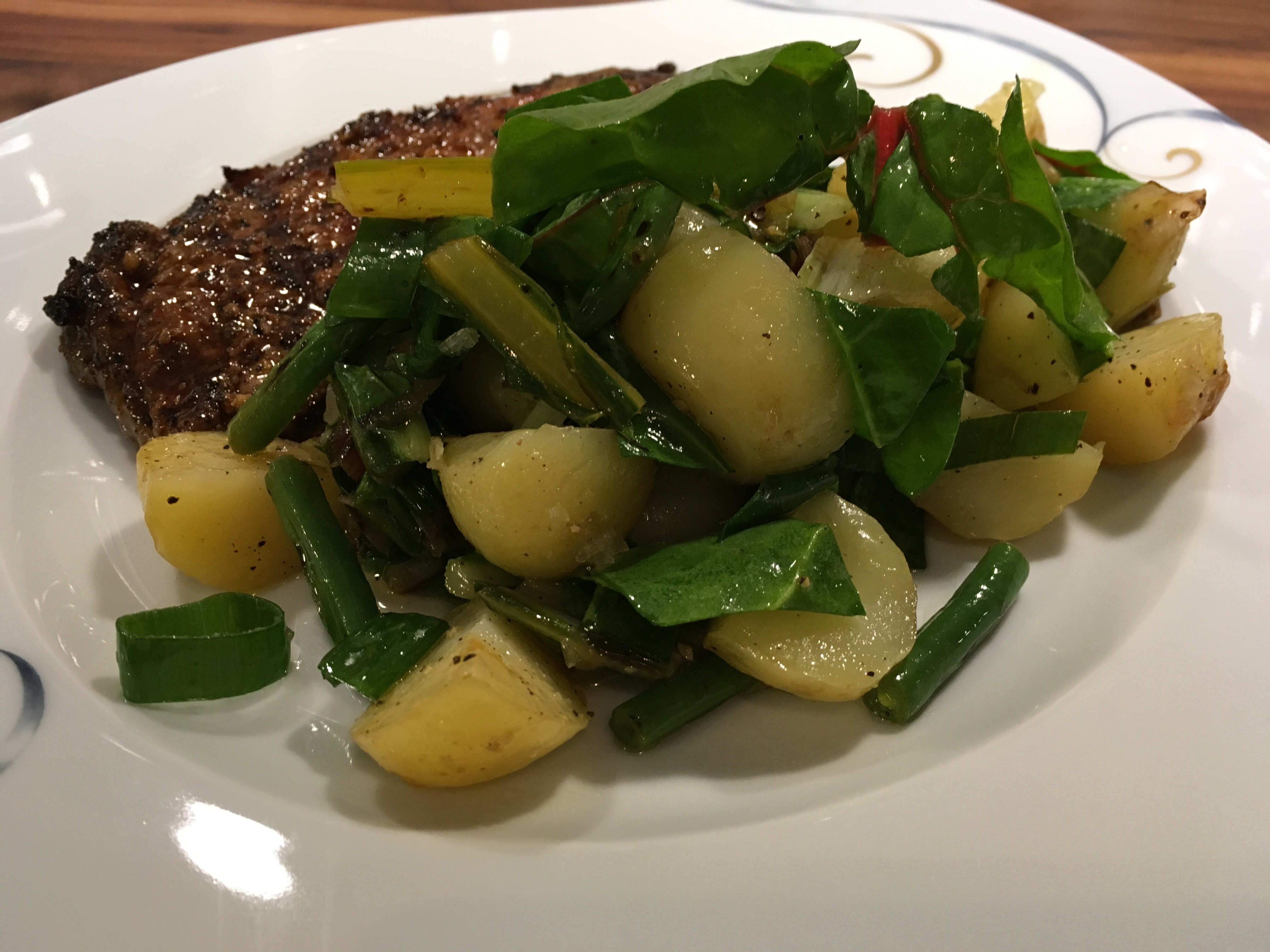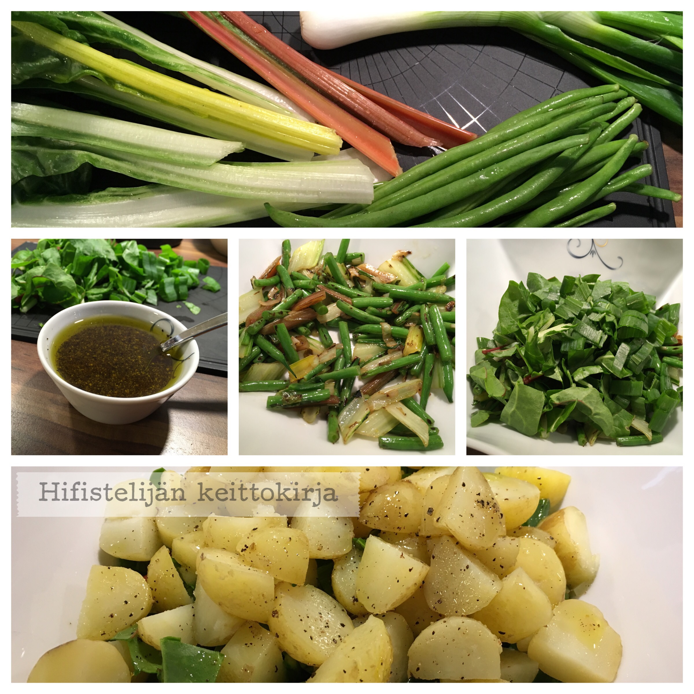 Pese ja keitä uudet perunat kypsiksi. Pese vihannekset. Pilko pavut, mangoldin varret ja sipulin valkoinen osa. Suikaloi 3-4 mangoldin lehteä ja sipulin varret. Paista pavut, mangoldin varret ja sipuli tilkassa öljyä niin että ne saavat hieman väriä. Pilko kypsät lämpimät perunat. Sekoita oliiviöljy, balsamico, suola, sokeri ja pippuri. Yhdistä kaikki ainekset kulhossa. Viimeistele sormisuolalla. Tarjoile heti