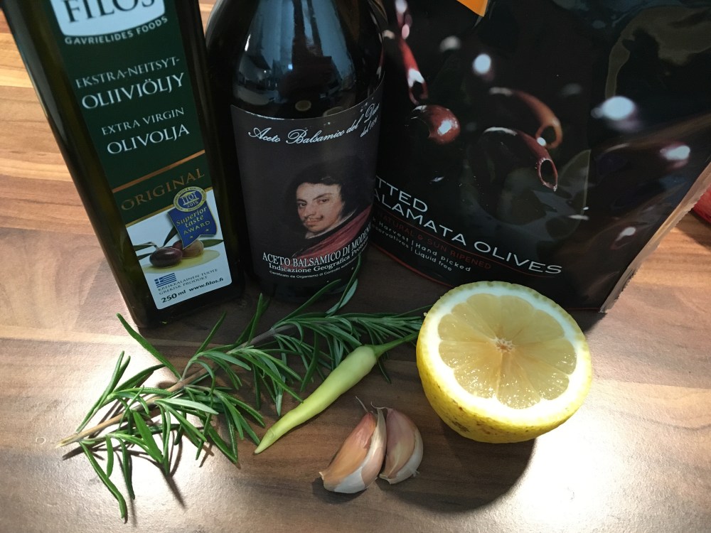 Hienonna chili, rosmariini ja valkosipuli. Sekoita oliiviöljyn, balsamicon ja sitruunamehun joukkoon. Mausta hunajalla ja mustapippurilla. Lisää oliivit. Anna maustua vähintään tunnin ajan