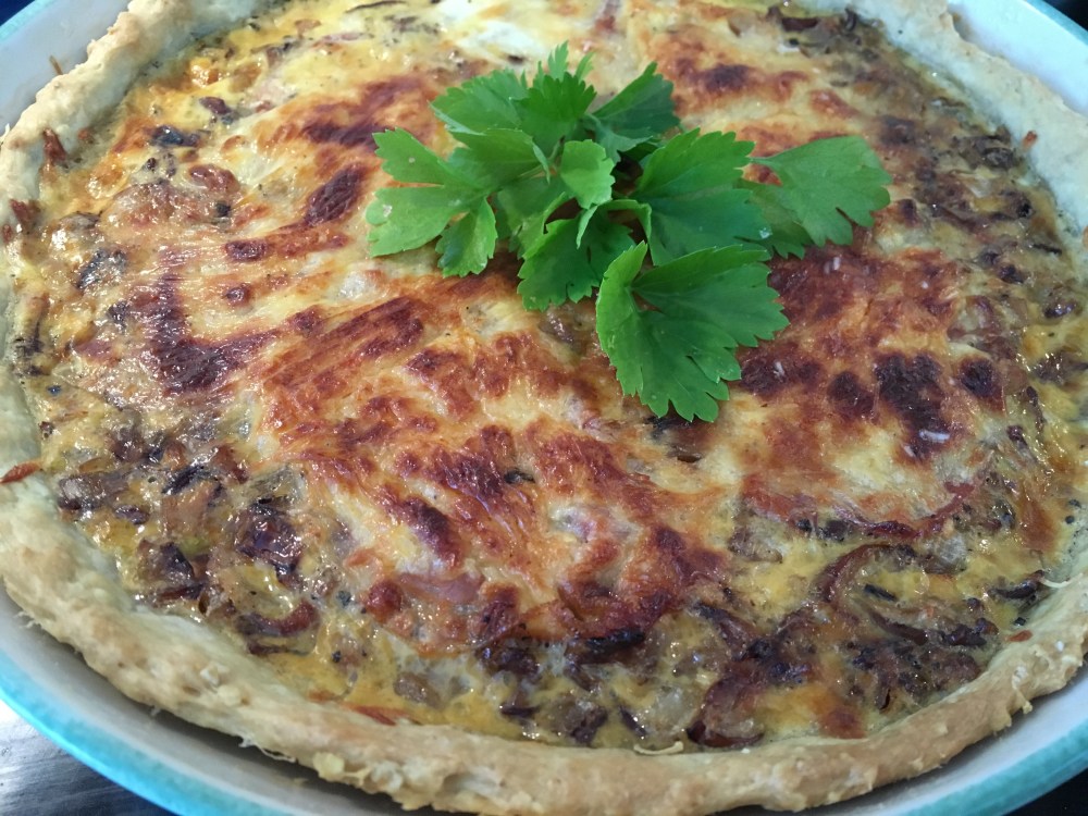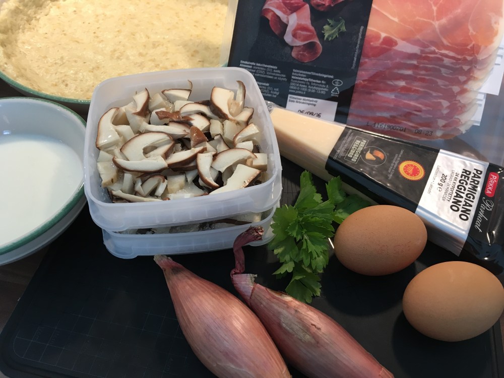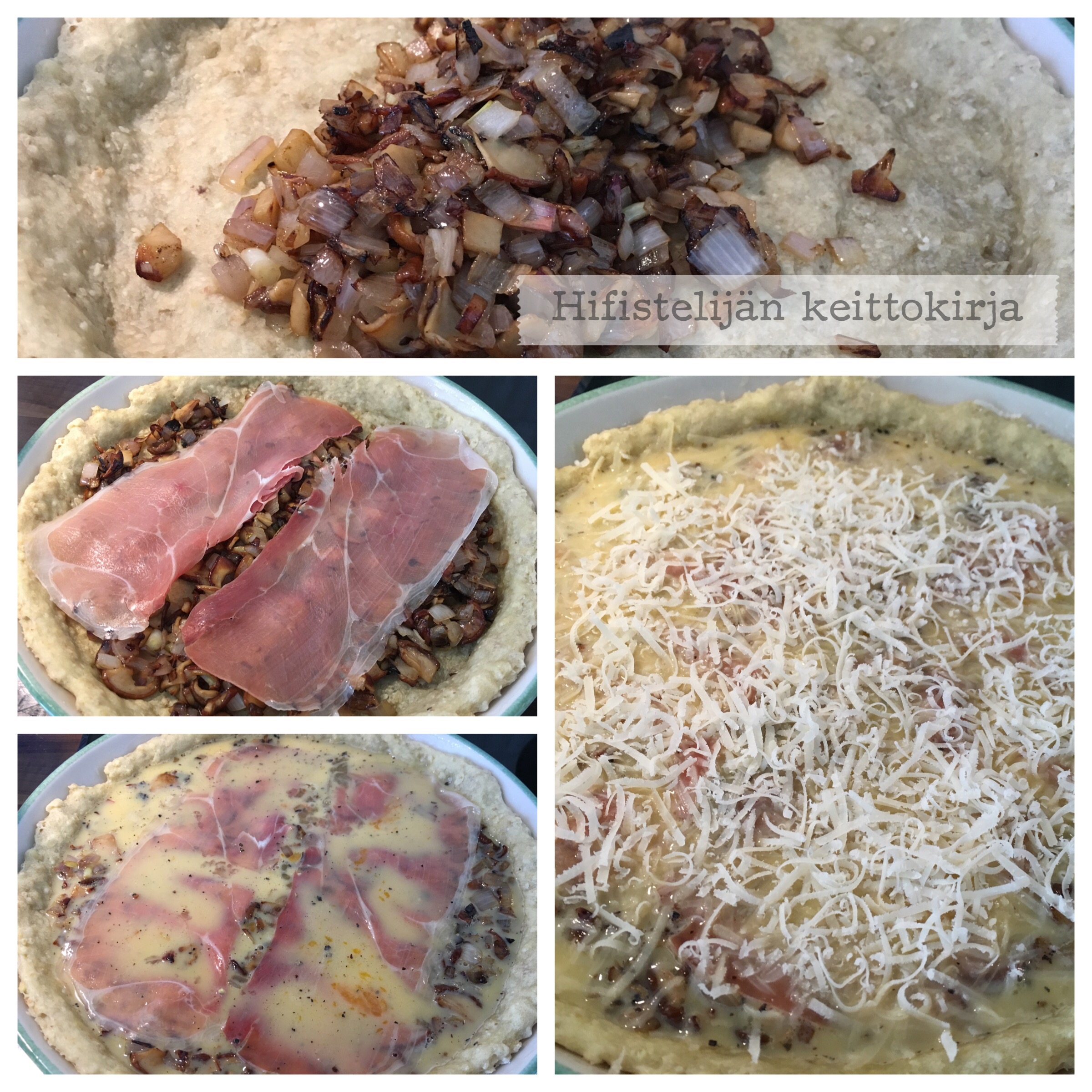 Paahda sienet kuivalla pannulla, lisää hieman voita ja kuullota sipulit, mausta kevyesti suolalla. Kaada esipaistetun pohjan päälle. Levitä ilmakuivatun kinkun siivut piirakan pinnalle. Sekoita maito ja munat, mausta mustapippurilla ja kaada seos kinkkujen päälle. Ripottele pinnalle parmesaanijuustoa. Paista 200 asteessa kunnes piirakka saa väriä ja täyte on hyytynyt, n. 20 minuuttia