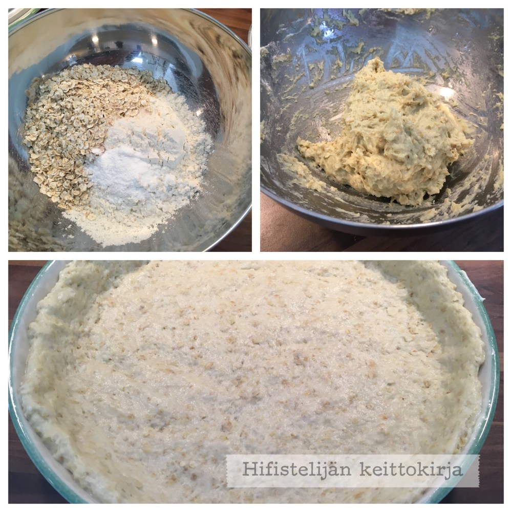 Sekoita ainekset keskenään. Taikinasta jää hieman tahmainen muttase levittyy helposti hieman jauhotetuin käsin voidellun piirakkavuuan pohjalle. Esipaista n. 12 minuuttia.
