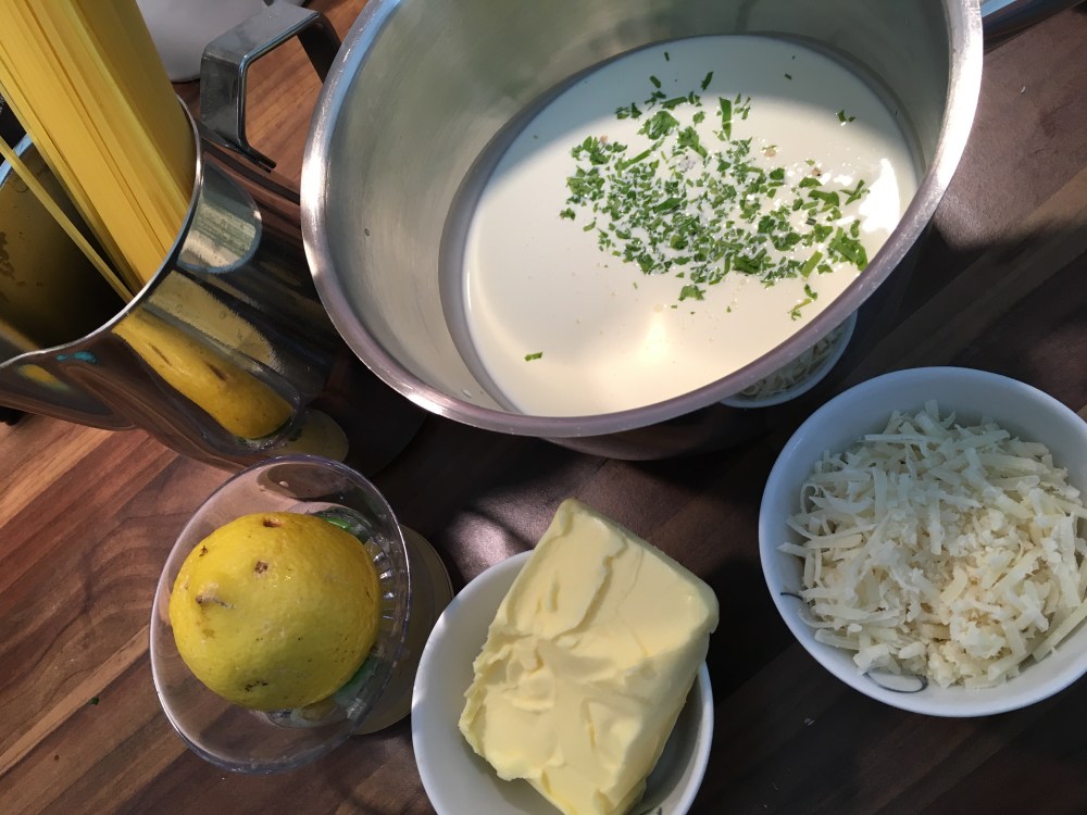 Laita pasta kiehumaan suolattuun veteen. Lämmitä kerma ja silputtu persilja kasarissa, kun kerma kevyesti kuplahtelee pienennä lämpöä ja lisää voi. Anna voin sulaa. Lisää raastettu sitruunan kuori. Lisää maistellen sitruunamehua, hunajaa ja suolaa, muista että lisätä voit aina, mutta pois et saa. Tavoitteena on raikas ja sitruunainen maku. Kaada kastike valutetun pastan sekaan. Pasta saa jäädä al denteksi