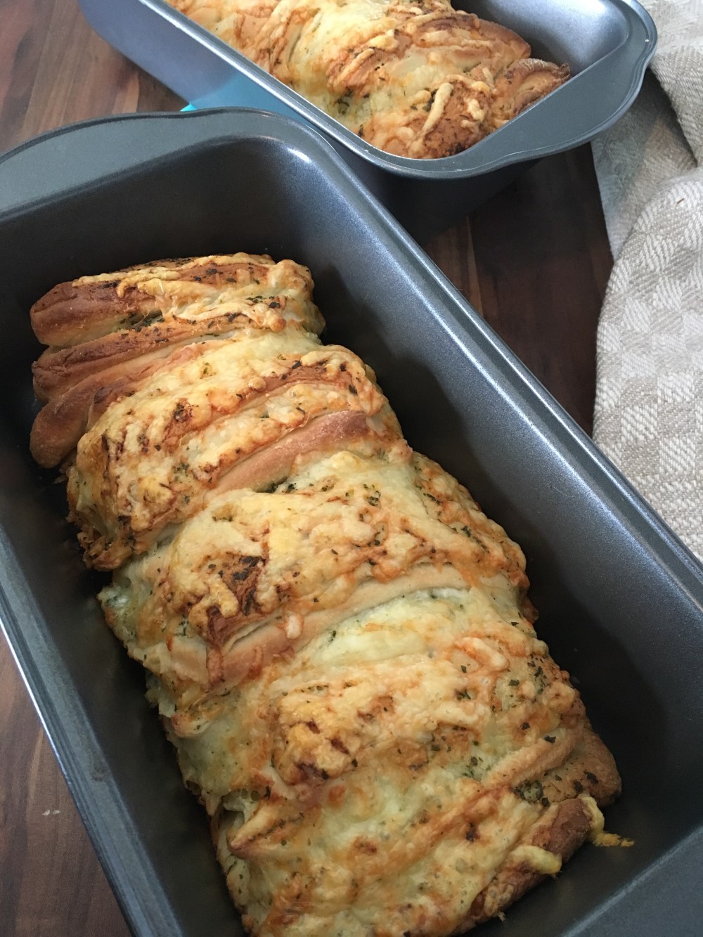 Purista valkosipulin kynnet pehmeän huoneenlämpöisen voin joukkoon, lisää persilja. Levitä voiseos taikina levyille ja raasta pinnalle reilusti mieleistäsi juustoa.