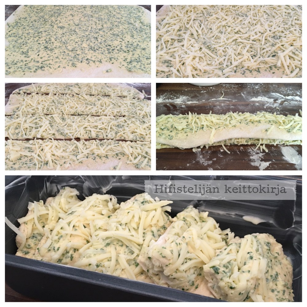 Leikkaa levyt pitkittäin neljään osaan, nosta osat päällekkäin ja leikkaa sitten molemmat pinot viiteen osaan. Nosta palat voideltuihin leipävuokiin. Anna kohota puolisen tuntia. Paista 225 asteessa 20-30 minuuttia, kunnes kauniin kullanruskea