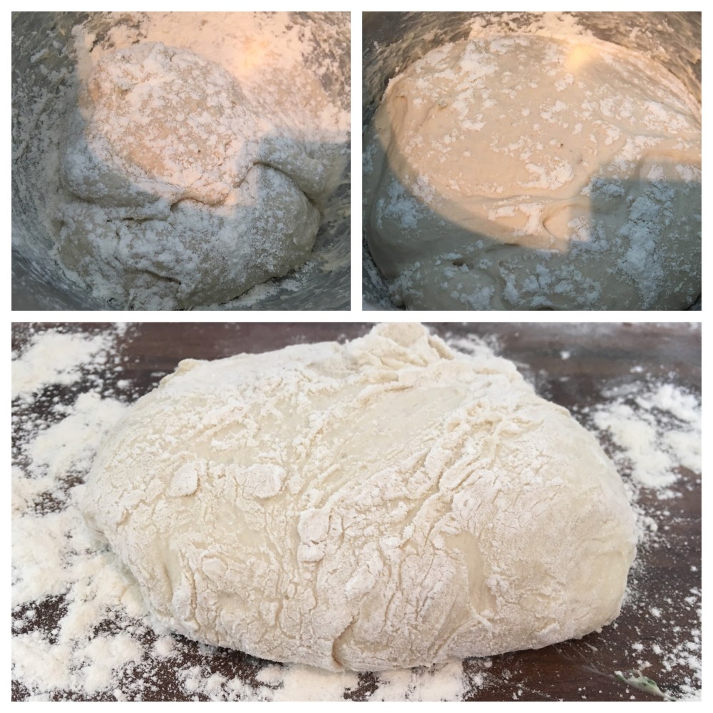 Mittaa taikinan ainekset kulhoon ja alusta elastiseksi. Yleiskoneessa keskinopeudella noin kymmenen minuuttia. Anna kohota kaksinkertaiseksi liinalla peitettynä. Jaa taikina kahtia ja kaulitse palat pienen uunipellin kokoisiksi levyiksi.