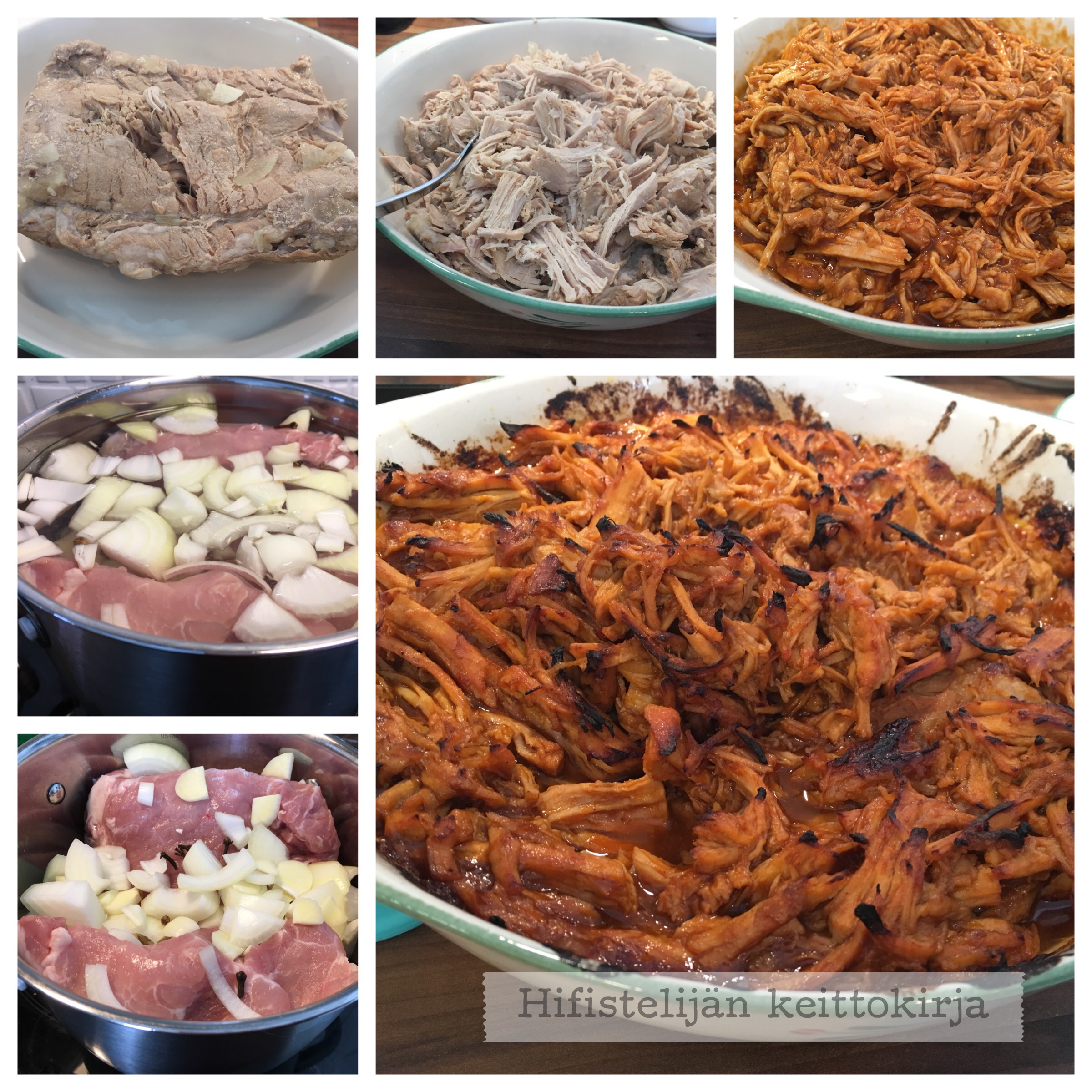 Ota iso kattila, laita possu kattilaan, ei tarvitse turhia siivoilla, sillä mahdolliset kalvotkin pääsääntöisesti sulavat pois. Pilko sipulit ja heitä kattilaan. Lisää neilikat ja vettä niin että possu peittyy. Aloita keittäminen, totea että valitsit liian pienen kattilan ja siirrä kaikki suurempaan kattilaan. Anna kiehua miedolla lämmöllä noin kolme tuntia. Nosta liha vatiin ja nyhdä se kahden haarukan avulla ihanaksi hahtuvaksi.