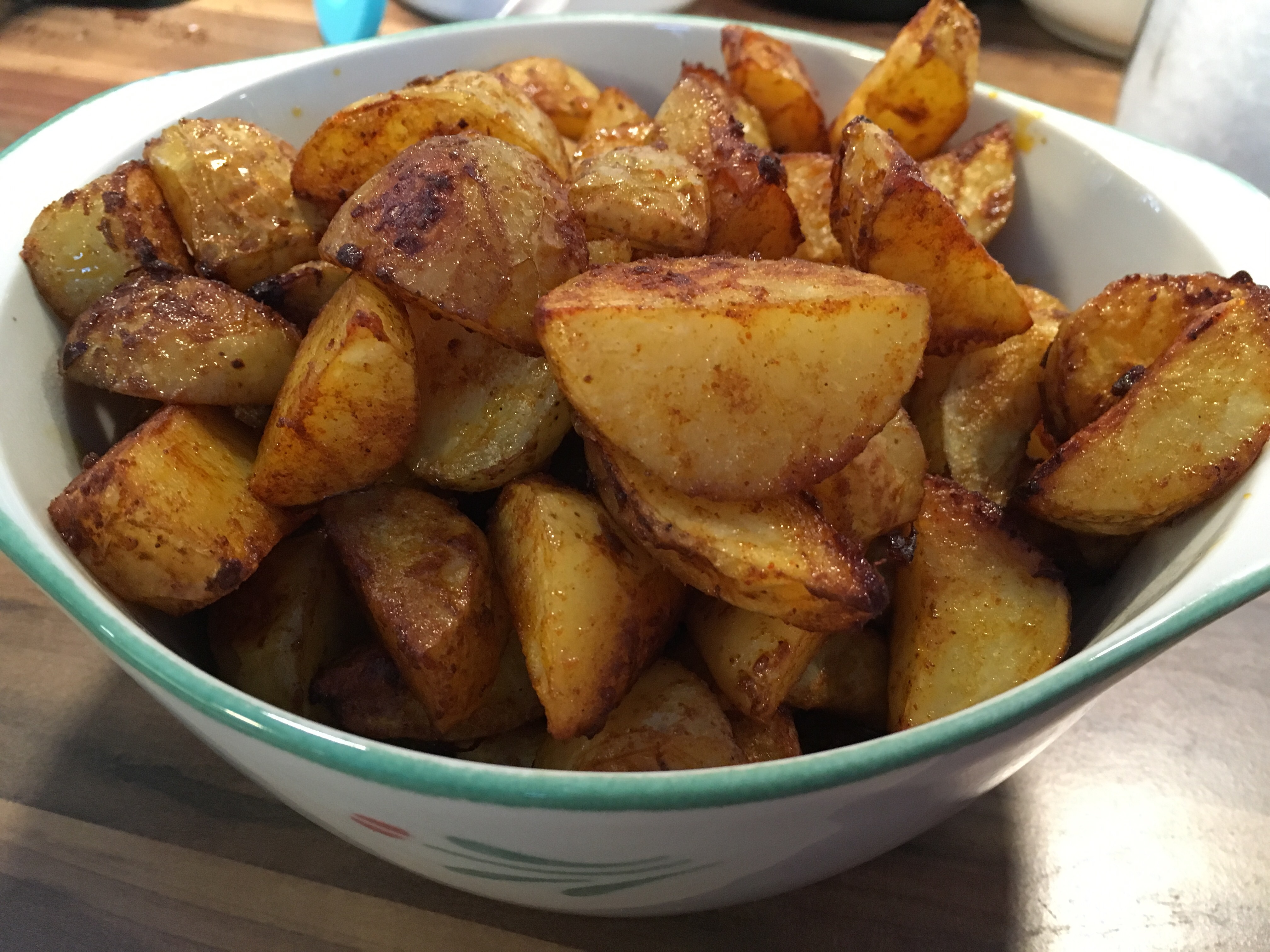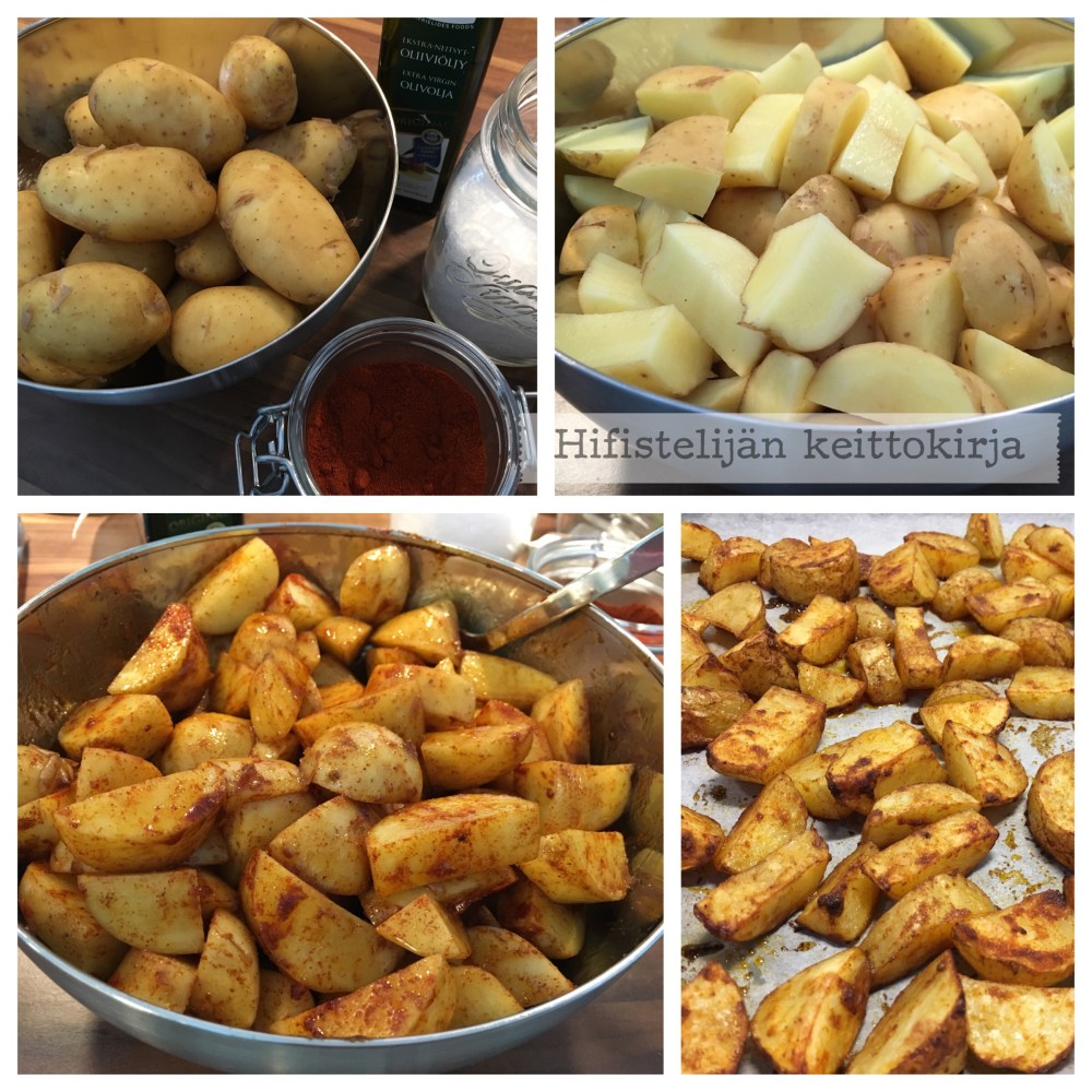 Pese ja paloittele perunat. Kaada perunoiden päälle öljy ja mausteet, sekoita hyvin. Levitä uunipellille. Paista 225 asteessa, kunnes perunat rapeutuvat ja saavat kauniin värin
