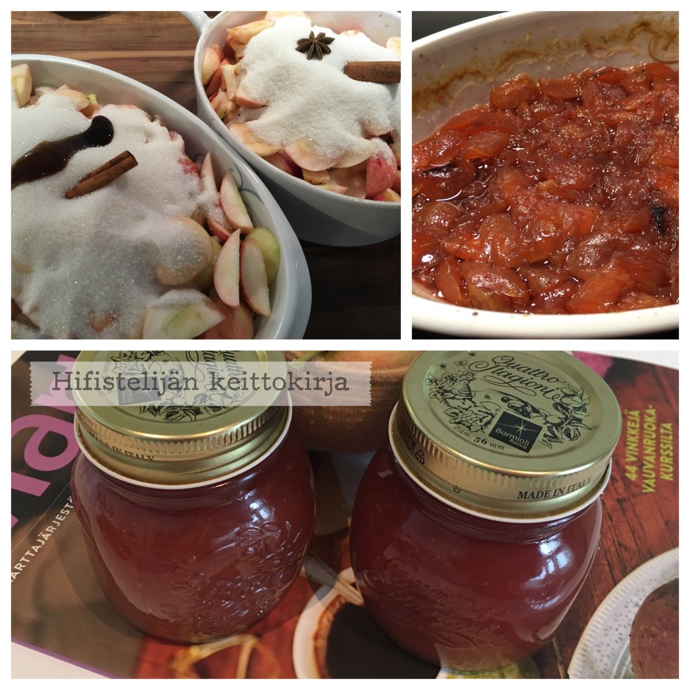 Ihanaa toffeiseksi karamellisoitunutta herkkuhilloa. Ohjeesta on kahta versiota, toisessa kun omenat kypsyvät ne soseutetaan, mutta itse annoin omenan palojen karamellisoitua liemessään ja soseutin vasta sitten