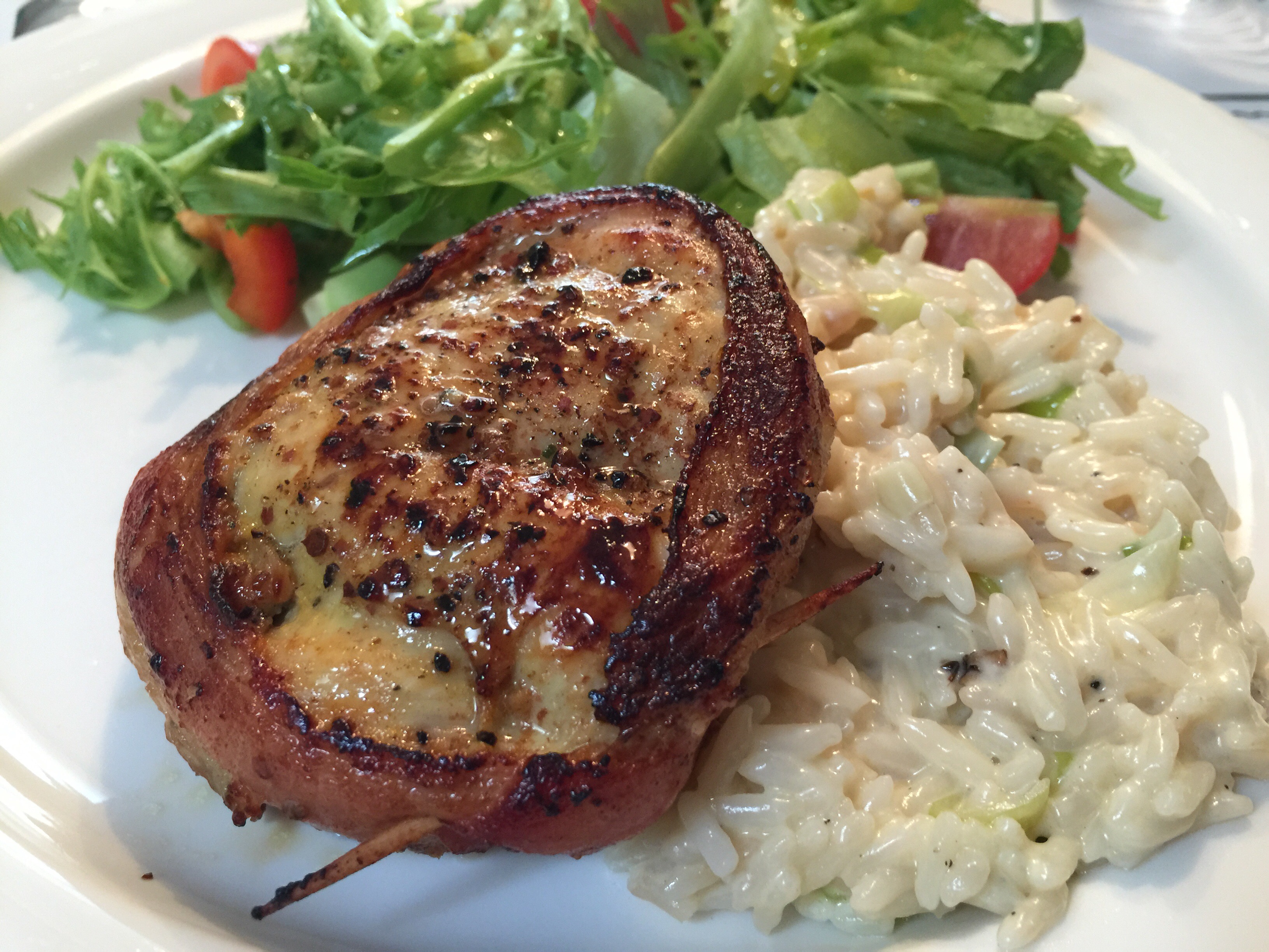 Kuivaa fileet talouspaperilla ja pyöräytä jokaisen fileen ympärille pekonisiivu. Kiinnitä cocktailtikuilla. Ripottele fileiden päälle hieman valkosipulijauhetta ja reilusti pippuria (mustapippuria tai viisipippuria). Paista kauniin kullanruskeiksi ja siirrä uunivuokaan. Jatka kypsennystä uunissa 200 asteessa kunnes riisi on kypsää