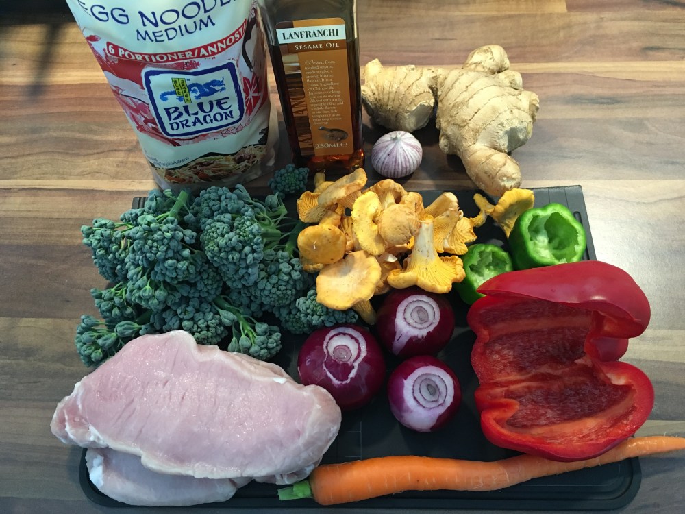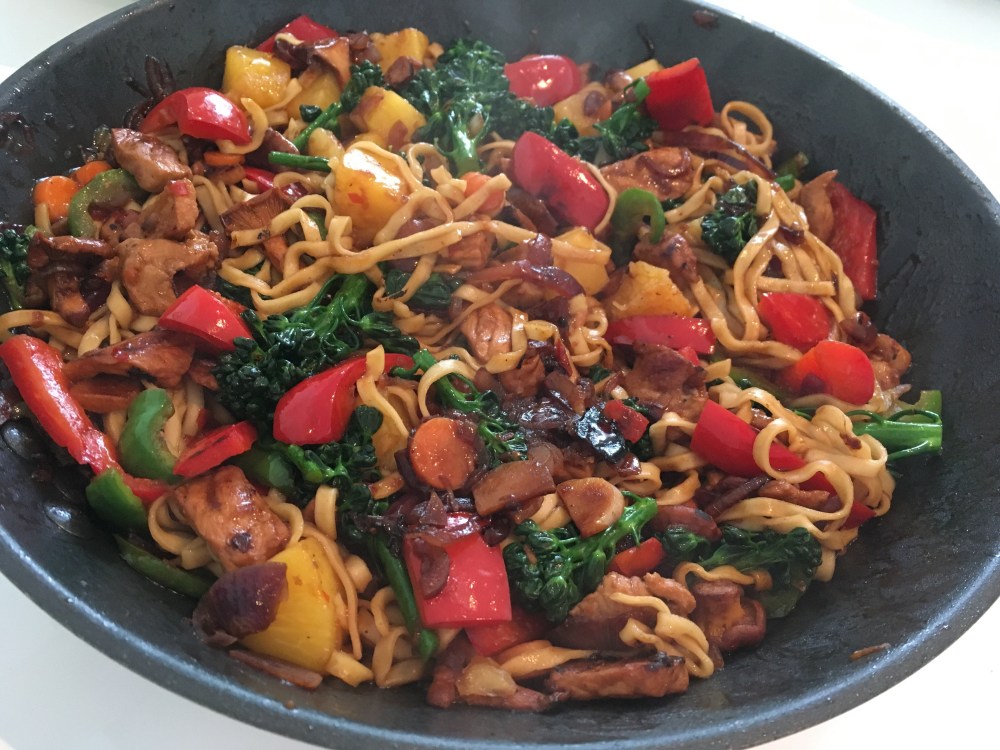 Keitä nuudelit pakkauksen ohjeen mukaan wokkauskypsiksi, eli kunnolla al denteksi. Suikaloi liha ja vihannekset. Kuumenna öljyä isossa paistinpannussa, lisää liha, paista ruskeaksi kovalla lämmöllä, lisää valkosipuli ja inkivääri, paista hetki. Lisää vihannekset ja anna niihinkin tarttua väriä. Lisää nuudelit, 1 rkl seesamiöljyä, sweet chilikastike ja ananaspalat. Anna kuumentua ja tarjoile