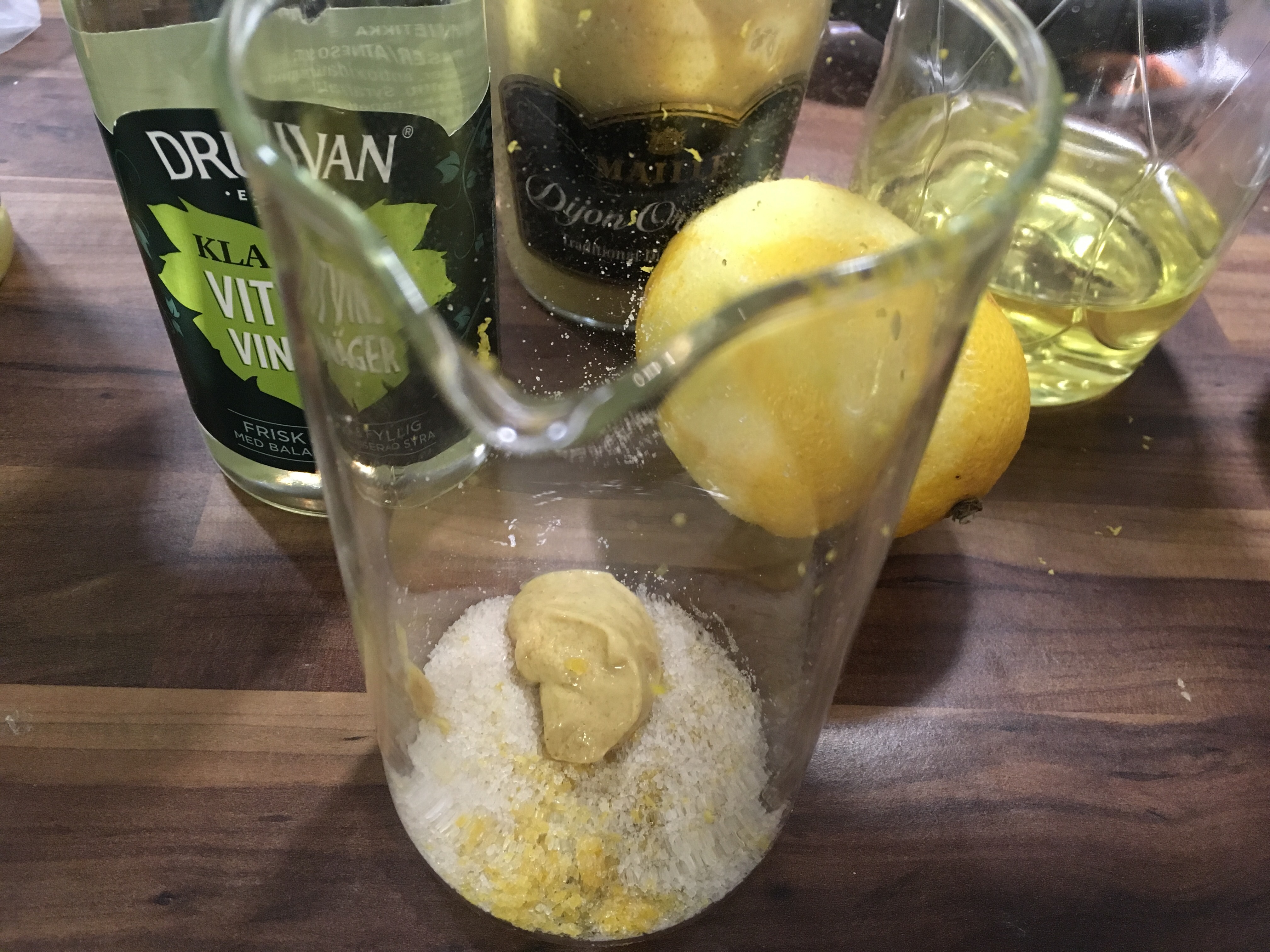 Mittaa kaikki ainekset kannelliseen kippoon, sulje kansi ja ravista. Salaatin kastike emulgoituu nopsasti, mutta vaatii uudelleen ravistelua jos sitä säilytetään jääkaapissa seuraavaan päivään