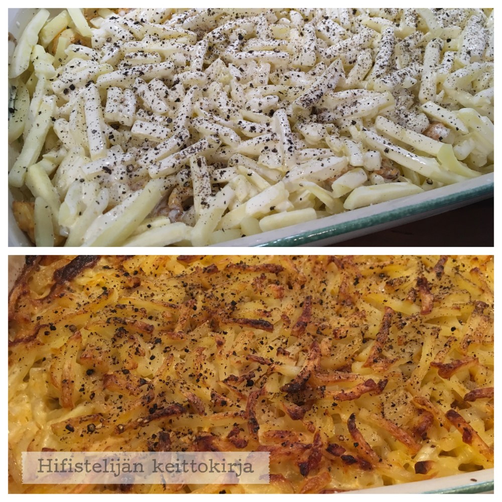 Voitele vuoka. Levitä puolet perunasipulisekoituksesta vuokaan, lisää (paistetut) kanasuikaleet, sitten loput perunasipulisekoituksesta ja kaada päälle kerma. Paista uunissa 200 asteessa noin tunti