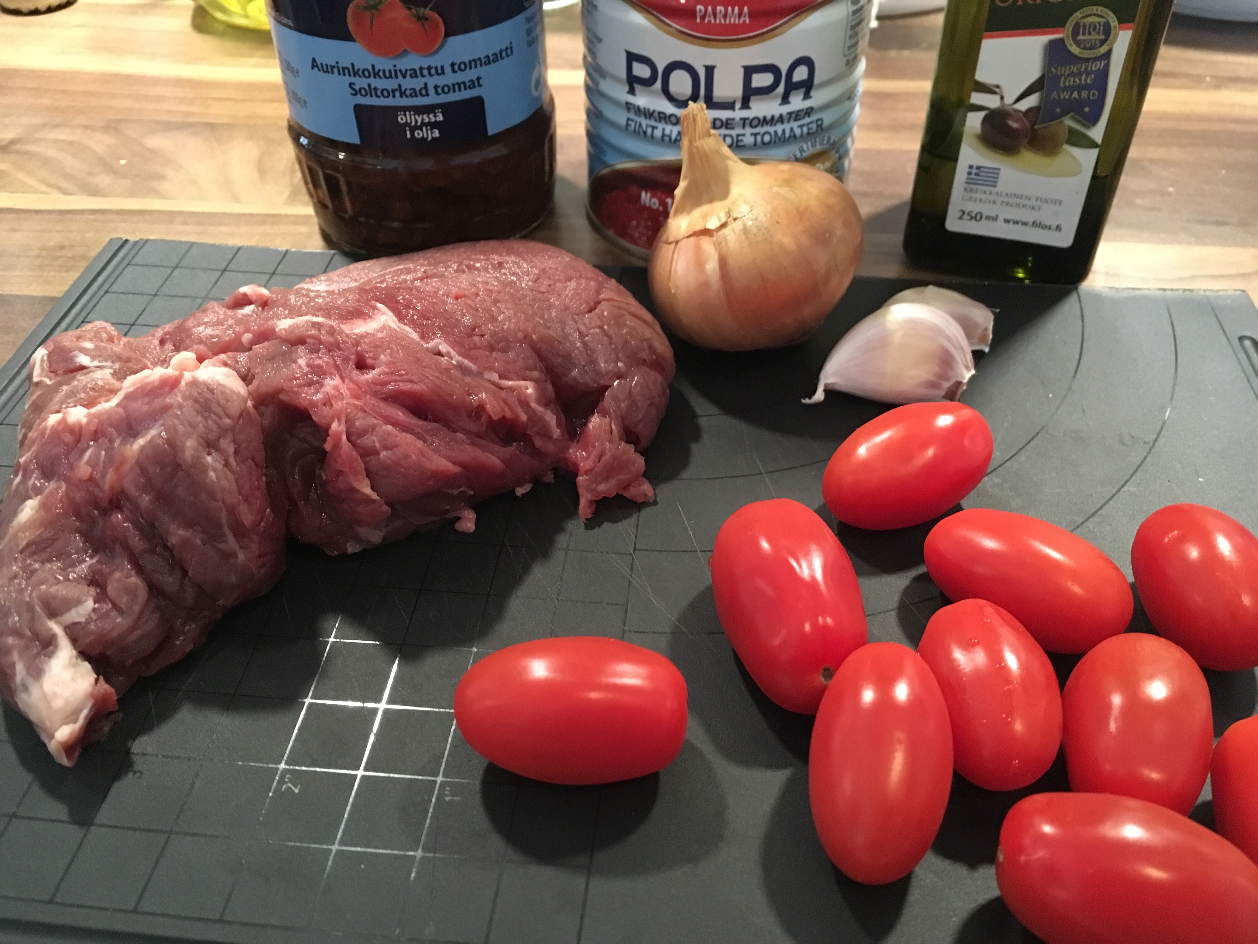 Viipaloi liha ohuiksi suikaleiksi, hienonna sipulit. Ruskista reilussa oliiviöljyssä pannulla. Lisää aurinkokuivatut tomaatit, basilika, pippuri ja suola. Kaada joukkoon tomaattimurska ja sokeri ja kiehauta. Puolita kirsikkatomaatit ja kaada kastikkeen joukkoon, kuumenna. Tarjoa pappardellen ja parmesaanin kera