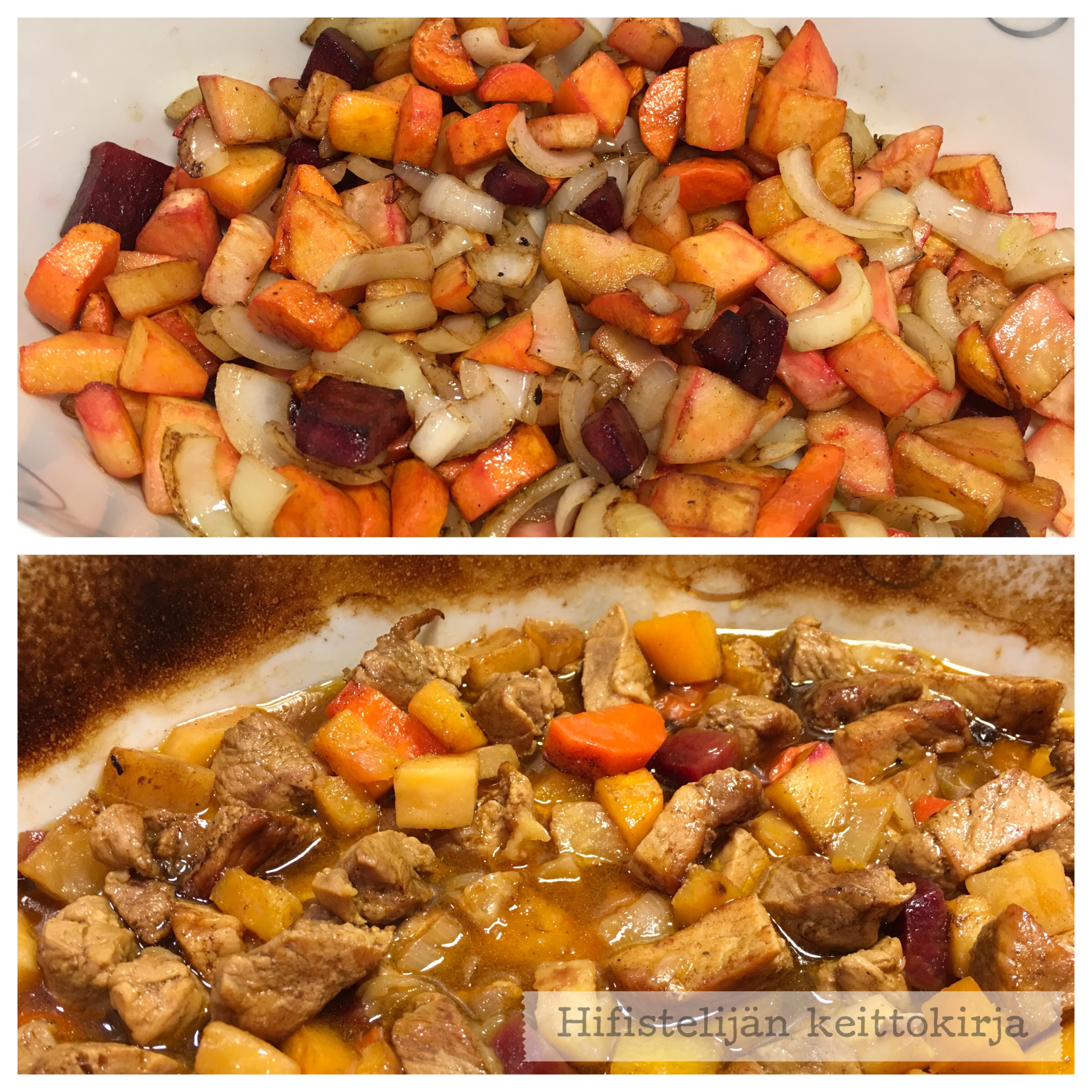 Rauhallisen talvista viikonloppuruokaa. Maistuu koko perheelle! Olisin oikeastaan halunnut karjalanpaistia, mutten jaksanut lähteä kauppaan. Pakastimessa oli possua ja jääkaapissa hiukan kaikenlaisia juureksia. Niistä syntyi herkullinen pata