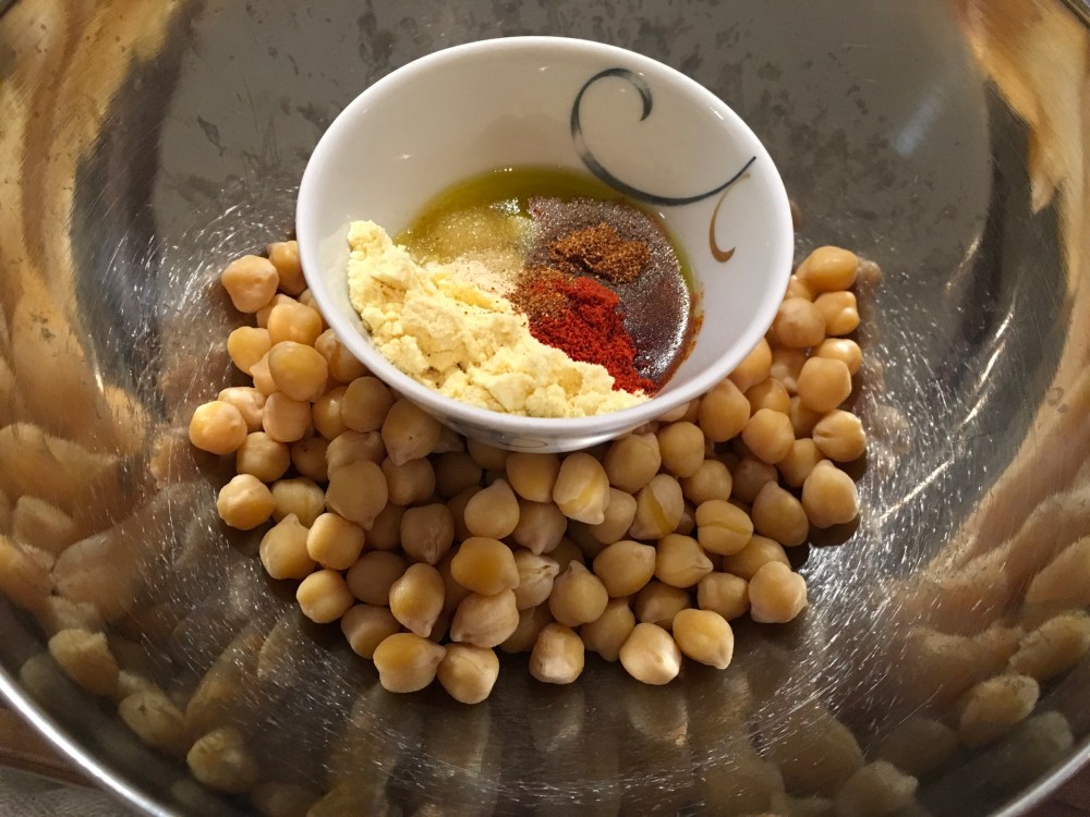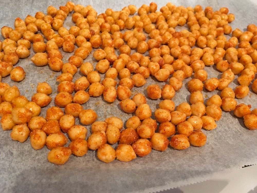 Sekoita mausteet rahnaksi ja lisää kikherneiden joukkoon, sekoita kunnolla sekaisin. Levitä kikherneet pellille ja paista uunissa 225 adreessa 20-30 minuuttia, välillä sekoittaen. Anna jäähtyä ja nauti