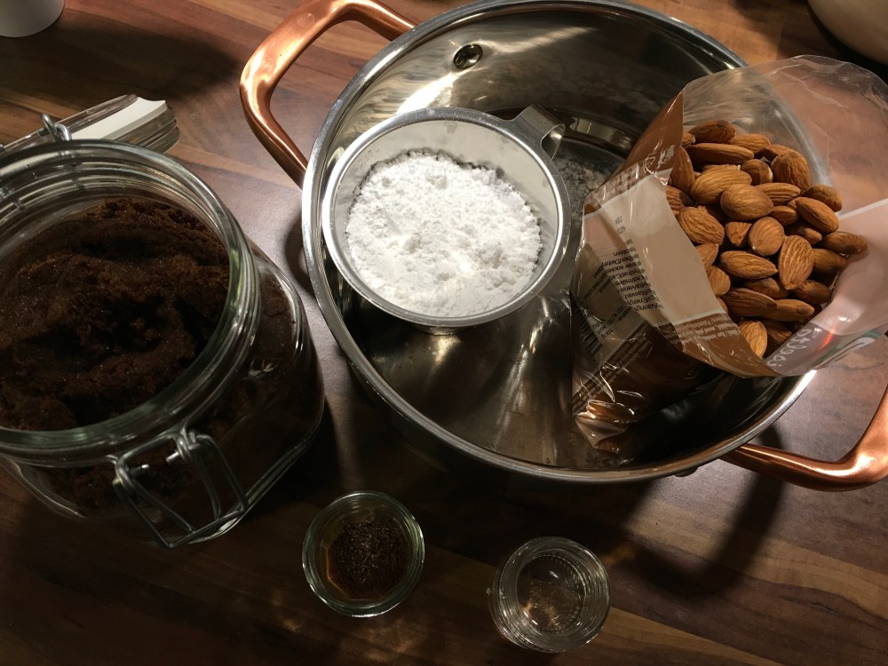 Mittaa mantelit, mausteet, sokerit ja vesi kattilaan. Kuumenna täydellä teholla huolellisesti sekoittaen. Kun seos kunnolla kuplii lisää hieman sormisuolaa ha alenna lämpöä. Sekoita kunnes sokeri on täysin sulanut, varo pohjaan palamista!