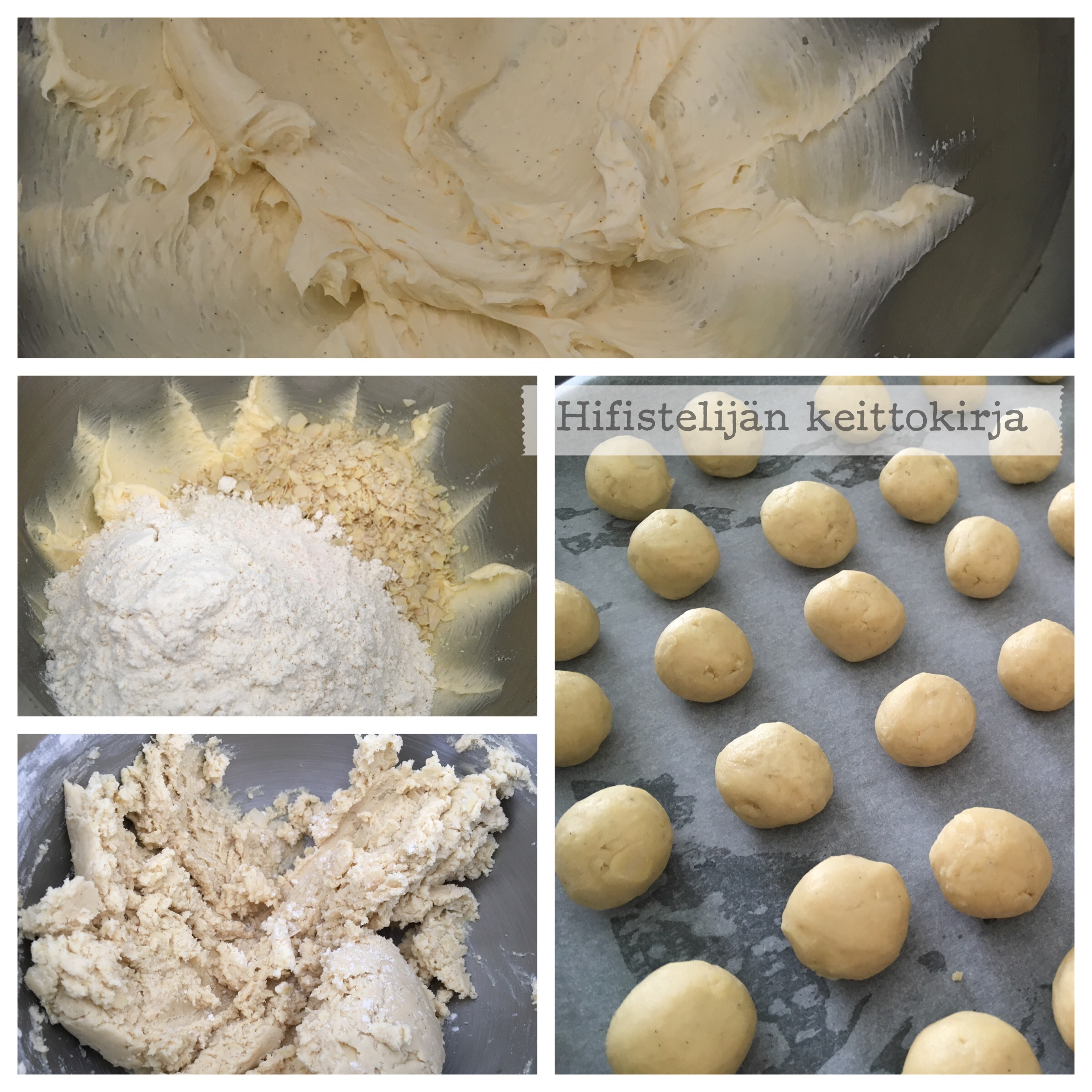 Vaahdota huoneenlämpöinen voi, tomusokeri ja vanilla bean paste kuohkeaksi vaahdoksi. Sekoita joukkoon vehnäjauhot, suola ja hienonnetut mantelit. Pyörittele taikinasta palleroita pellille ja paista 200 asteessa n. 7 minuuttia, kunnes kauniin kullanruskeita, mutta ei liian tummia! Kierittele lämpimät keksit kertaalleen tomusokerissa. Anna jäähtyä ja kierittele vielä uudelleen tomusokerissa, saadaksesi kauniin lumisen pinnan ja ihanan yltiömakean kuoren