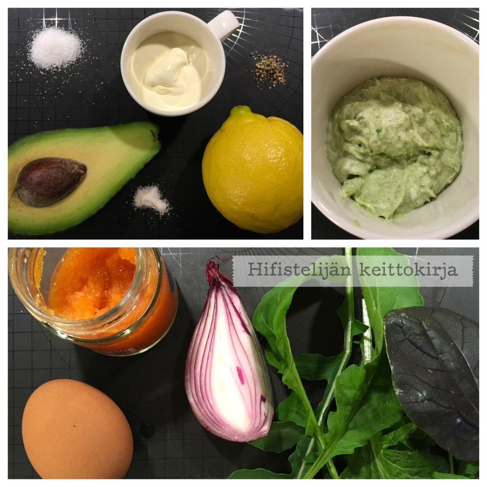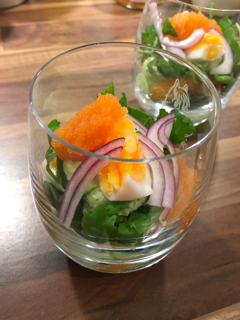 Keitä munaa 5 minuuttia, jäähdytä nopeasti, kuori ja lohko. Viipaloi sipuli. Muusaa avokado, sekoita joukkoon suola, pippuri, sokeri ja sitruunamehu sekä smetana. Kokoa kerroksittain aineksia juomalasiin tai muuhun astiaan