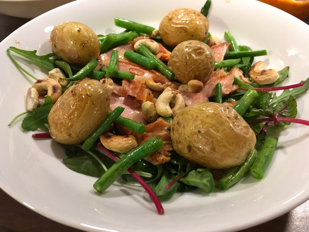 Pese perunat ja hiero niihin oliiviöljyä ja suolaa, paahda uunissa kypsäksi 200 asteessa noin 30 minuuttia, perunan koosta riippuen. Paahda cashewpähkinät kuivalla pannulla. Pese ja pilko pavut, paista pannulla vähässä öljyssä. Kokoa lautasille salaattia, kalaa, papuja ja perunoita (vielä lämpiminä!) kaada hieman veriappelsiinivinegretteä.