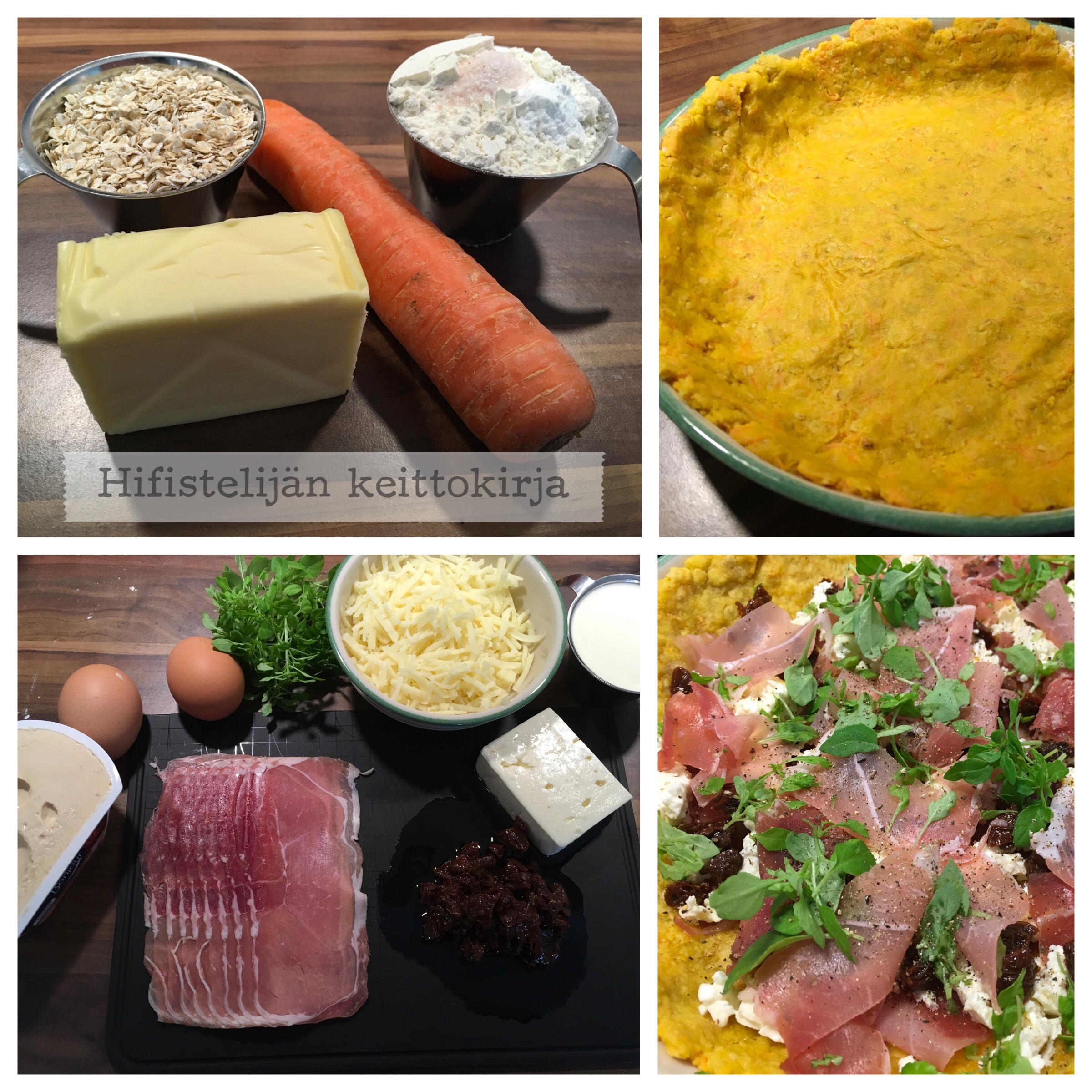 Sekoita pehmeä (jopa osin sulanut) voi ja porkkanaraaste. Lisää kaurahiutaleet, vehnäjauhot, suola ja leivinjauhe ja sekoita tasaiseksi taikinaksi. Taputtele jauhotetuin käsin voideltuun piirakkavuokaan ja esipaista 225 asteessa 5-10 minuuttia.