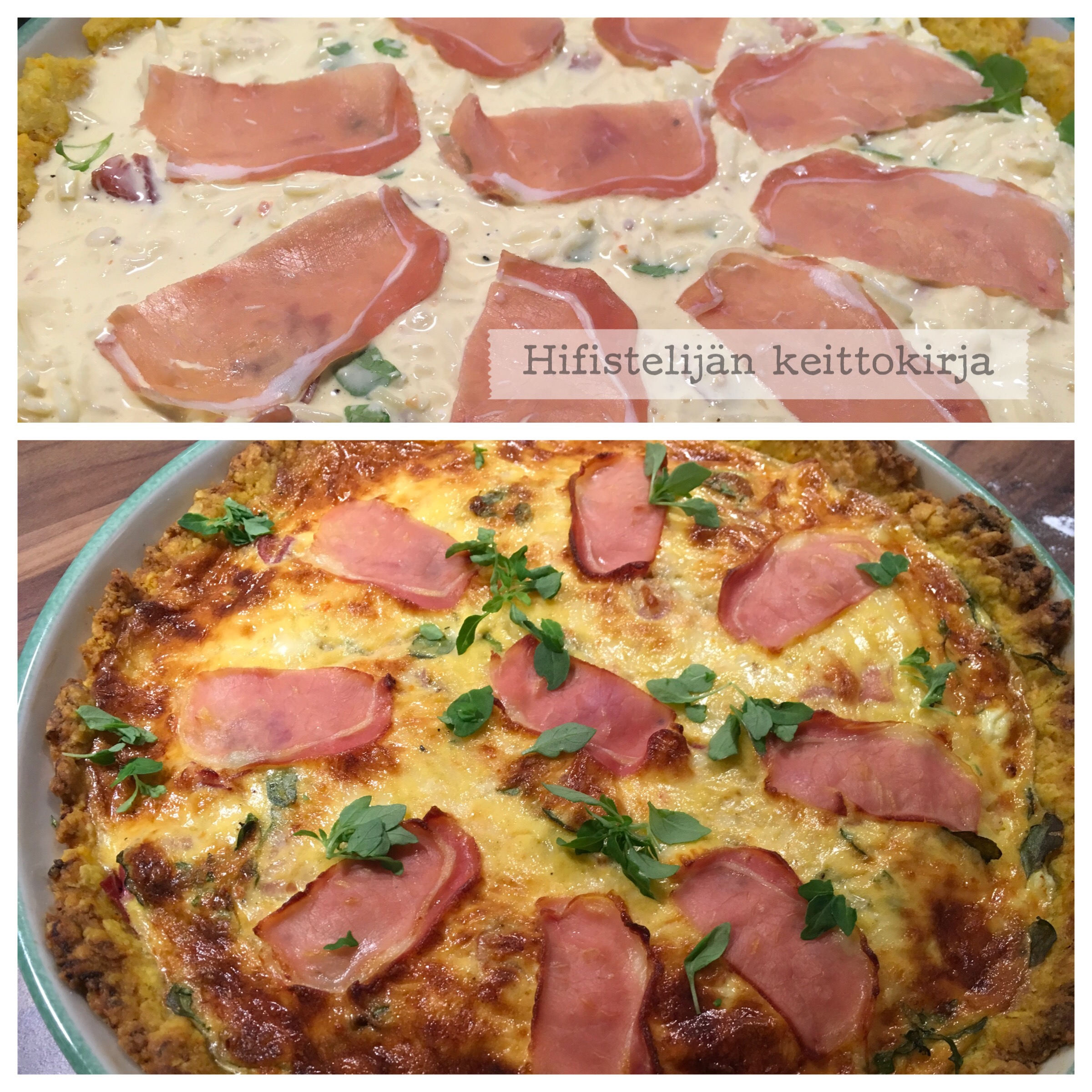 Levitä silputtu kinkku, murustettu feta ja aurinkokuivatut tomaattikuutiot sekä tuoretta basilikaa esipaistetulle pohjalle. Sekoita juustoraaste, tuorejuusto (nyt aurinkokuivattu tomaatti), munat ja kerma ja kaada täytteiden päälle. Paista kunnes pinta on kullanruskea, n. 20-25 minuuttia.