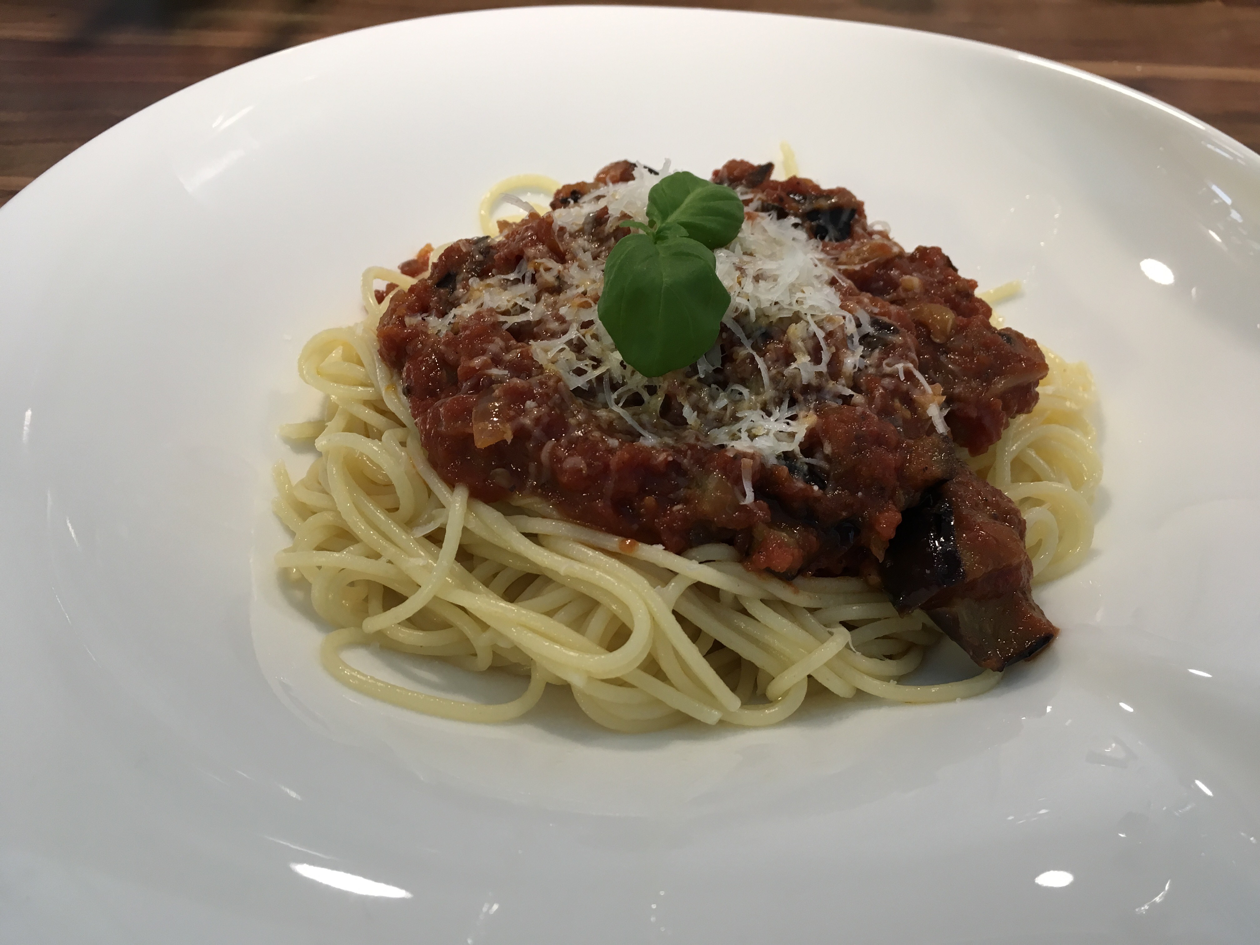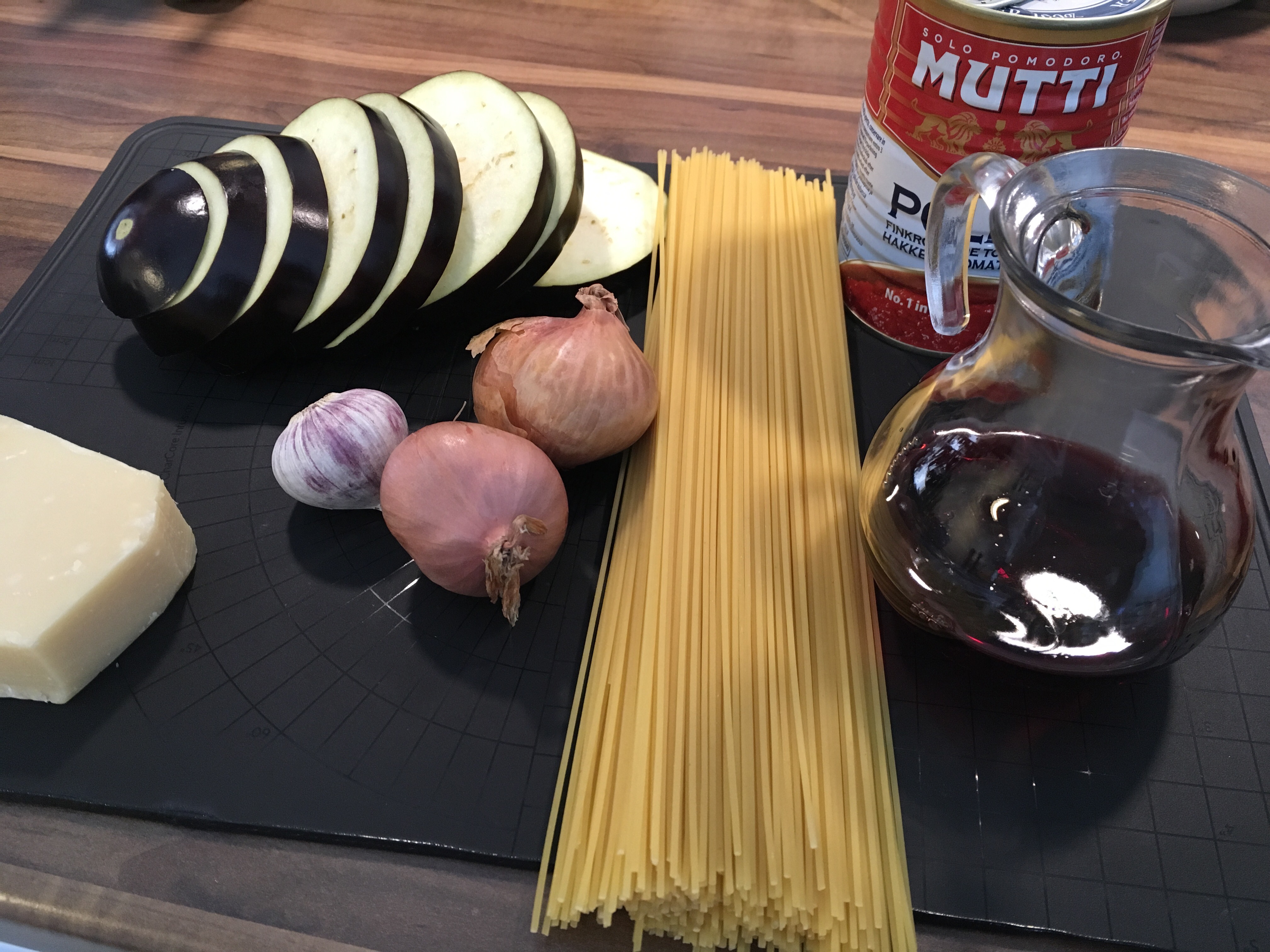 Kuori ja silppua sipulit. Paista kullanruskeiksi ja lisää sokeri. Lisää tomaattimurska, tilkka vettä, jolla huuhtaiset purkista loput murskasta ja punaviini. Mausta mustapippurilla. Anna muhia hiljalleen ilman kantta (tarpeeksi isossa kattilassa ei roisku yli) puolisen tuntia jotta kastike saostuu. Viipaloi munakoiso 1 cm vahvuisiksi viipaleiksi, ripottele niiden pinnalle suolaa ja pyyhi 15 minuutin päästä neste ja suolat pois, toista toiselle puolelle. Paloittele munakoisoviipaleet ja paista reilussa määrässä oliiviöljyn ja voin seosta. Lisää paistetut munakoisot tomaattikastikkeeseen ja lisää suurin osa pecorinoraasteesta myös.