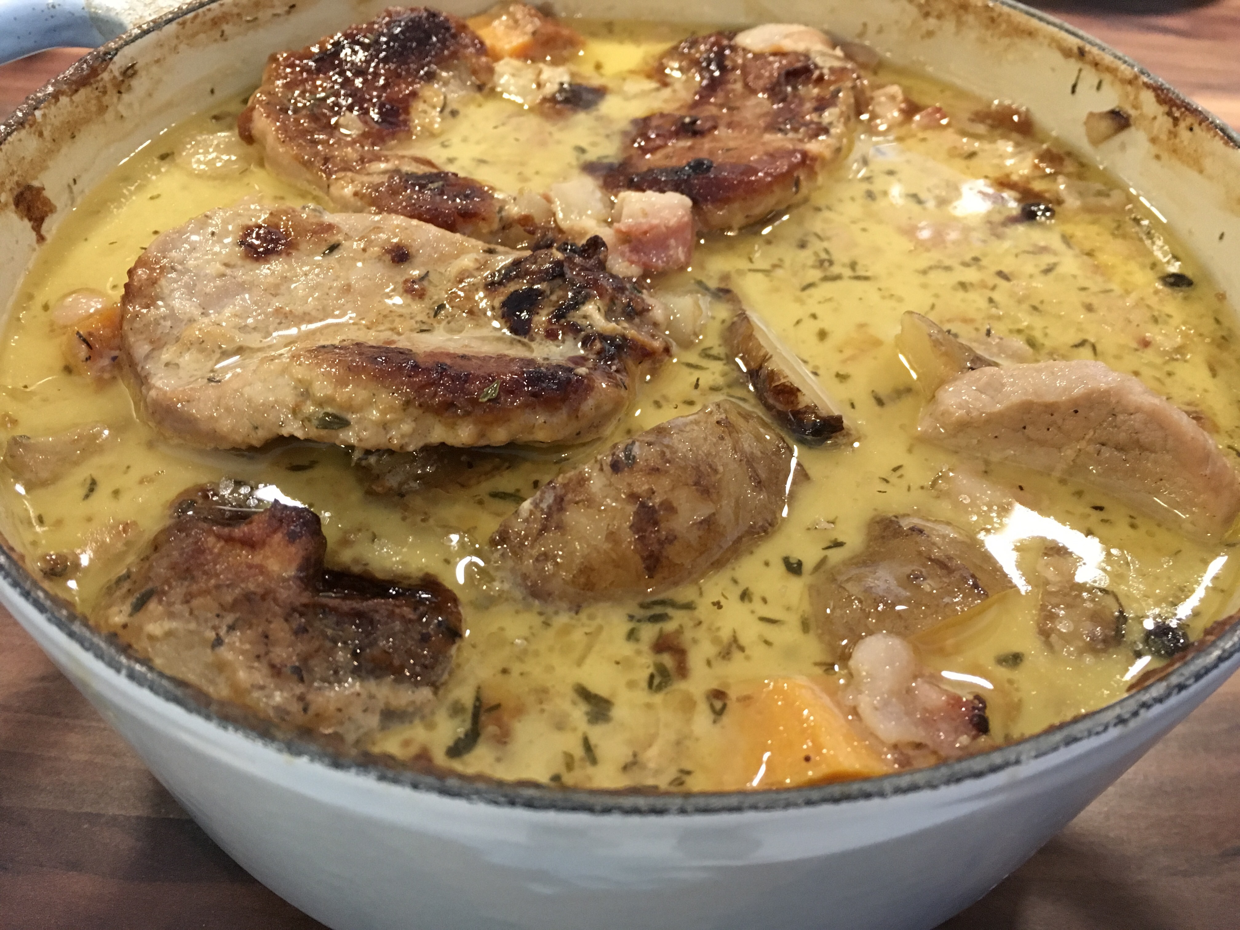 Kuori ja paloittele bataatti ja lohko maa-artisokat (näitä ei tarvitse kuoria). Lisää pataan. Lisää siideri, vesi, kerma, mausteet ja fondi. Anna kiehahtaa liedellä ja siirrä sitten 200 asteiseen uuniin n. puoleksi tunniksi, kunnes vihannekset ovat kypsiä.