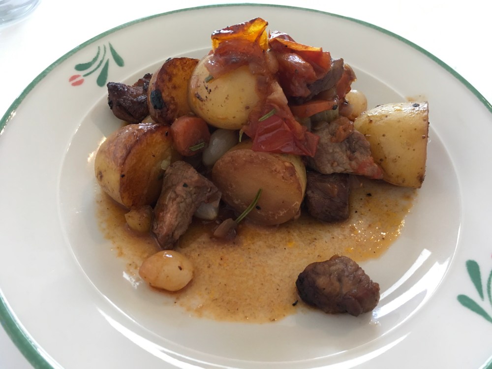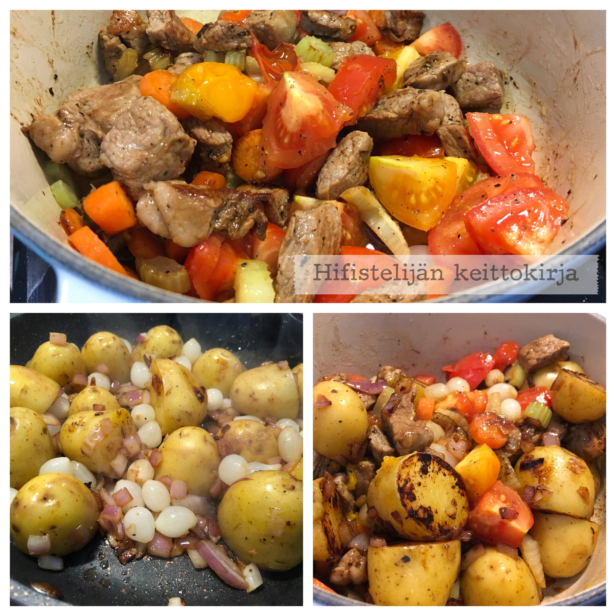 Pilko liha. Pese, tarvittaessa kuori ja pilko vihannekset. Paista lihapalat voissa ja mausta suolalla ja pippurilla. Siirrä lihat pataan. Paista myös selleri ja porkkana. Paista sipulit ja perunat. Kaada kaikki pataan ja lisää tomaatit puolikkaina. Lisää lihaliemi ja punaviini ja hauduta 175 asteessa ilman kantta 20 minuuttia ja tarvittaessa peitä kannella ja jatka vielä paistamista noin 20 minuuttia, kunnes perunat ovat kypsiä