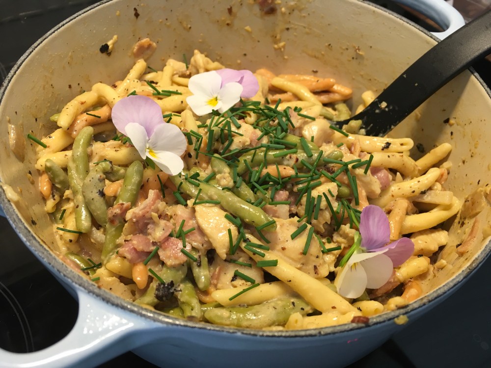 Laita pekonit kylmään pannuun ja paista hieman väriä niihin, lisää sipulit sekä oliiviöljy ja kuullota, lisää broilerisuikaleet ja paista kypsiksi. Lisää kermaa ja parmesaani, sekoita ja nosta pois levyltä.