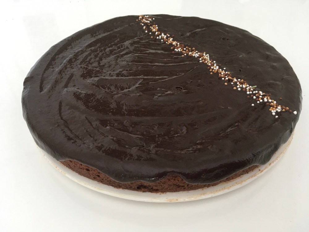 Rouhi/raasta suklaa hienoksi, lisää kerma ja lämmitä varovasti vesihauteessa (tai mikrossa lyhyin sykäyksin). Levitä kakun päälle ja koristele haluamallasi tavalla. Kakku maistuu ihan sellaisenaan, koska se on aika makeaa, mutta kevyesti vatkattu kermavaahto kruunaa tämän herkun.