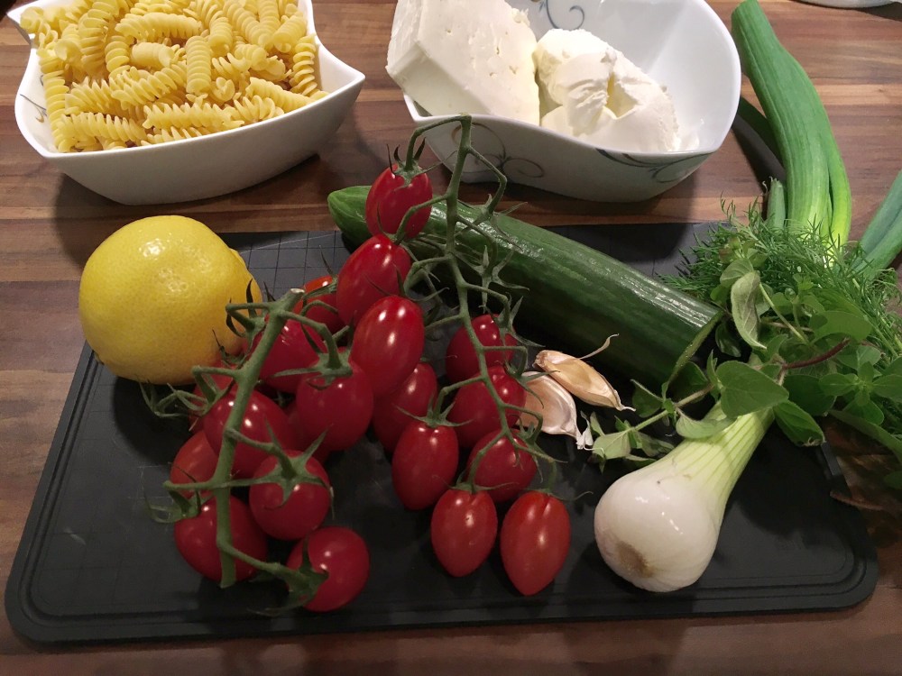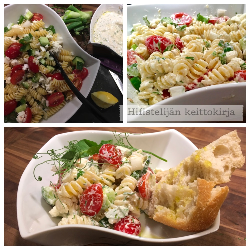 Keitä pasta suolatussa vedessä ja jäähdytä. Pese ja silppua kurkku, tomaatit ja sipuli. Murustele feta ja sekoita kaikki keskenään. Lisää kastike ja anna maustua vähintään tunti jääkaapissa