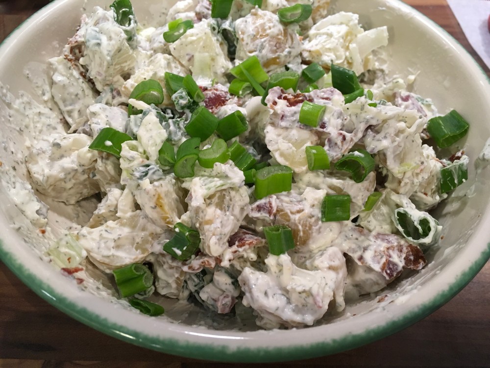 Juuri ennen tarjoilua, sekoita sipulit ja pekonit perunoiden joukkoon. Maista ja mausta tarvittaessa ripauksella suolaa