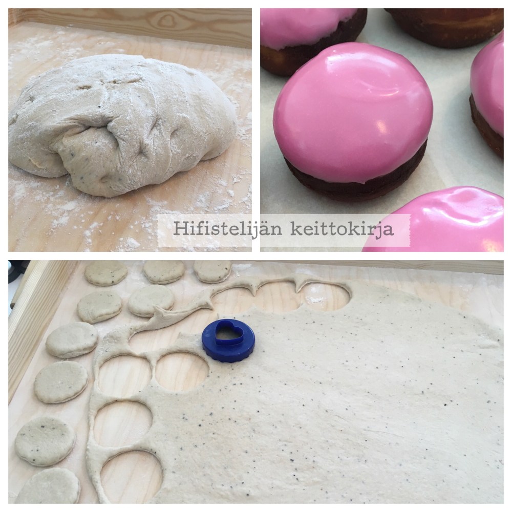 - Tästä taikinasta suosittelen itse tekemään pieniä hillomunkkeja n. 25-30 kappaletta, eli yksi kaulinta kerta. Lopusta taikinasta kannattaa pyöritellä reikämunkkeja, jolloin saat molempia. Lisäksi hillomunkkien täyttäminen ja kuorruttaminen on yllättävän rankkaa puuhaa ja hilloa ja pomadaa kuluu paljon
