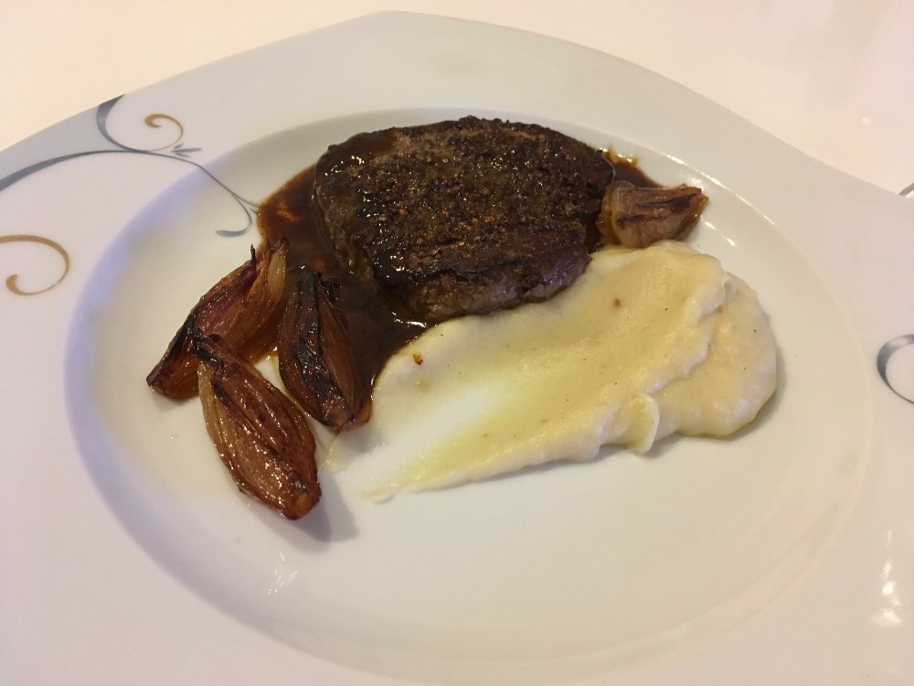 Kuori sipulit, älä leikkaa koko kantaa pois, sillä kanta pitää lohkot kasassa. Lohko kapeahkoiksi lohkoiksi. Paista voissa kullan ruskeiksi, lisää sokeri ja balsamico, kun balsamico on redusoitunut lisää lihaliemi, sammuta levy ja peitä kannella. Anna muhia jälkilämmöllä kunnes muu ruoka on valmista ja sipulit ovat täysin läpikuultavia ja pehmoisia.