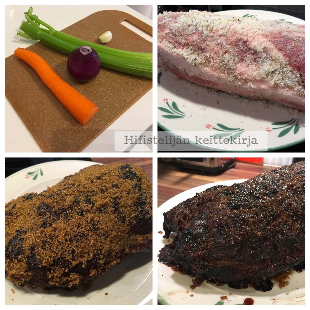 Nosta liha pellille tai muuhun uuninkestävään astiaan. Siivilöi neste kasariin, keitä kunnes koostumus muuttuu kastikemaiseksi. Jos tätä ei tapahdu niin suurusta haluamallasi tavalla. Kuumenna uuni 250 asteeseen. Sekoita fariinisokeri ja 1 tl suolaa ja hiero kaslerin pintaan. Laita uuniin kunnes sokeri karamellisoituu. Anna hetki vetäytyä ja leikkaa tarjolle paksuhkoja viipaleita.