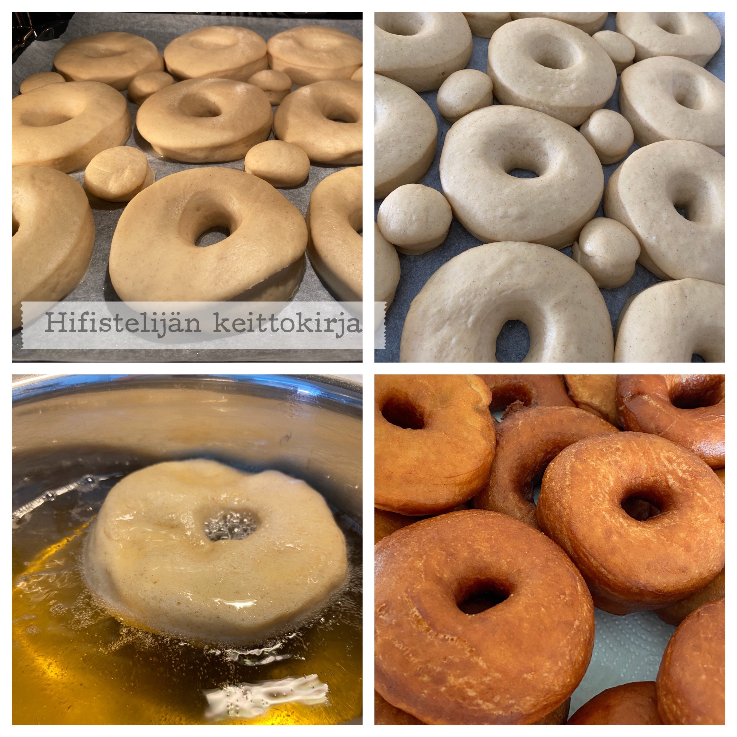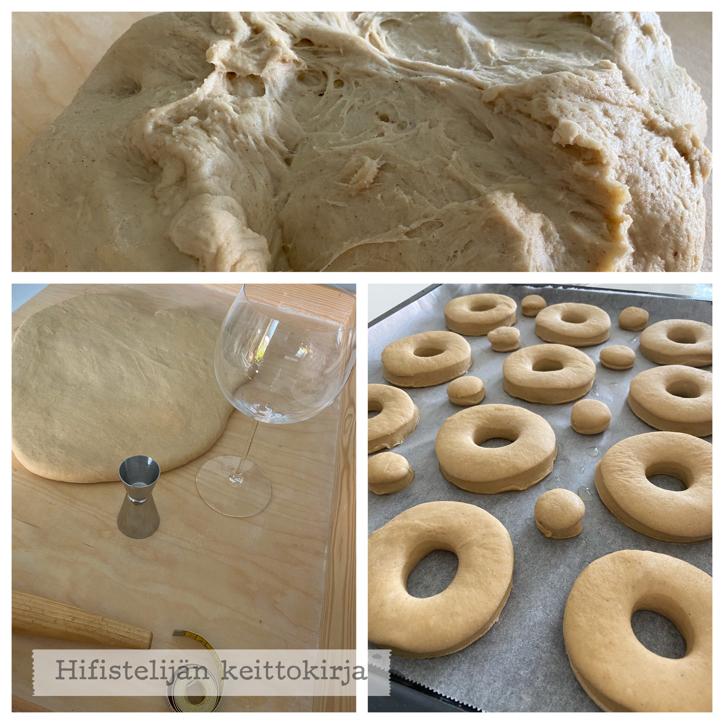 Kauli taikina 1,5-2 cm paksuksi levyksi. Leikkaa muotilla donitseja. Itse saan tästä 22 donitsia reikineen, ios et halua donitsin reikiä, niin taikinasta tulee 24 donitsia. Yritä ottaa mahdollisimman monta donitsia ensimmäisestä kaulinnasta, sillä taikina on seuraavalla kaulinnalla hankalampaa käsitellä. Kohota donitsit öljytyllä leivinpaperilla tai öljytyllä pellillä, jotta ne irtoavat helposti. Itse kihotan höyryuunissa tunnin, mutta lämpöisessa kahden tunnin kohotus on hyvä.