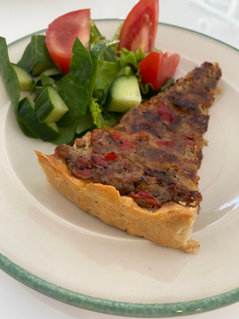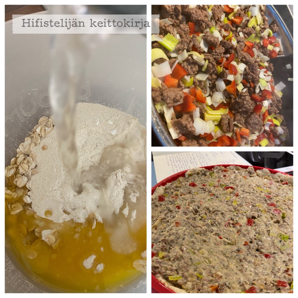 Lisää täyte pohjan päälle ja paista 200 asteisessa uunissa noin 30 minuuttia, kunnes pohja on kypsä ja täyte ruskistunut.
